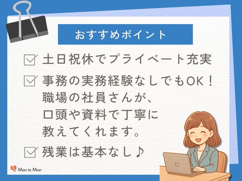 求める人材: 【応募資格】 未経験OK 特別な知識・スキルは一切不要です。 入社後、職場で丁寧に教えていただけるので、 事務職の経験がない方でも大丈夫です。 ~~~~ 未経験からスタートした方が半数以上 Man to Manでは他にも以下の様なスタッフさんが活躍されています。 ・派遣社員としてスキルを磨きたい方。 ・主婦の方。 ・アルバイト/パートからの転身の方。 ・短時間勤務からフルタイムに切り替えたい方。 ・工場でのお仕事に興味がある方 ・製造業にチャレンジしたい方。 ・学歴不問の職場で働きたい方。 ・介護をしながら働きたい方 仕事に対してこんなお悩みありませんか? ・女性の活躍できる職場で働きたい。 ・20代、30代、40代、50代活躍中の職場で働きたい。 ・日勤の固定勤務で働きたい。 ・土日休みの職場で働きたい。 ・交通費支給の職場で働きたい。 ・扶養控除内OKの職場で働きたい。 Man to Manには、 ハローワークや一般求人誌には掲載されていないお仕事情報もたくさんありますので、 まずはお気軽にお問合せください。