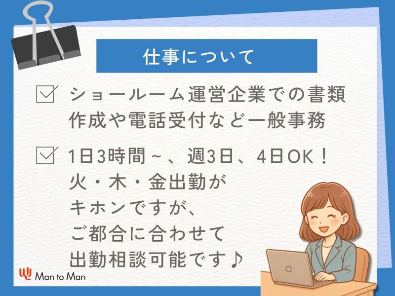 仕事内容: 【職種】 ショールーム運営企業での書類作成や電話受付など一般事務 【仕事内容】 職場は、国内外問わず、 様々なメーカーの製品を展示する ショールームを運営する会社です。 【仕事内容】 時短勤務OKの、一般事務のお仕事です。 具体的なお仕事は… ・書類作成 ショールームに製品展示をする企業に お渡しする紹介用書類などを作成します。 ・メールのやり取り ・電話対応 取引先企業にショールームの連絡や 書類のやり取りなどをします。 →やり取りは、日本企業のお客様や、 東京事業所(社内)の方とのやり取りがメインです。 ☆もし英語・中国語のスキルがある方は、 海外企業さんとの簡単なやり取りでも活躍できるかも♪ ・発送準備 月に1-2回程度、書類や小さめの自社製品を 発送する準備作業をすることも。 →木曜、金曜にこの発送・入荷作業があるので、 木・金は極力出勤して頂けると大変助かります♪ 残業は基本ありませんので、定時帰宅OK! 【おすすめポイント】 ・座り作業のデスクワーク ・1日3時間~、週3日、4日OK! 火・木・金出勤がキホンですが、 ご都合に合わせて出勤相談できるので、お子さんの居る方も働きやすい職場です♪ ・事務の実務経験なしでもOK! 職場の社員さんが、口頭や資料で 丁寧に教えてくれます。 弊社の先輩社員も1名居ますので、 安心して教え合いながら仕事に励めます♪ 【職場の特徴】 職場で一緒に働く事務社員の方は、 中国の企業とのやり取りをメインにしている方。 仕事や勤務日程の相談もしやすく、 主婦(主夫)の方が働きやすい職場です。 こんなご希望ありませんか? 「子どものお迎えまでの時間だけでも働きたい。」 「週3-4日だけ働きたい」「扶養内で働きたい」 「事務職は未経験だけど、PC作業は得意♪」 「ちょっと英語/中国語のスキルを活かしてみたい」 そんな主婦・主夫さんにオススメのお仕事です! 就業時間、出勤日数の調整も、相談可能です。 《未経験で出来る事務のお仕事を他にも探している》 《フルタイムの事務のお仕事はないの?》 という方にも、他の職場/お仕事をご紹介できますので、 まずはぜひ、お気軽にご応募ください♪
