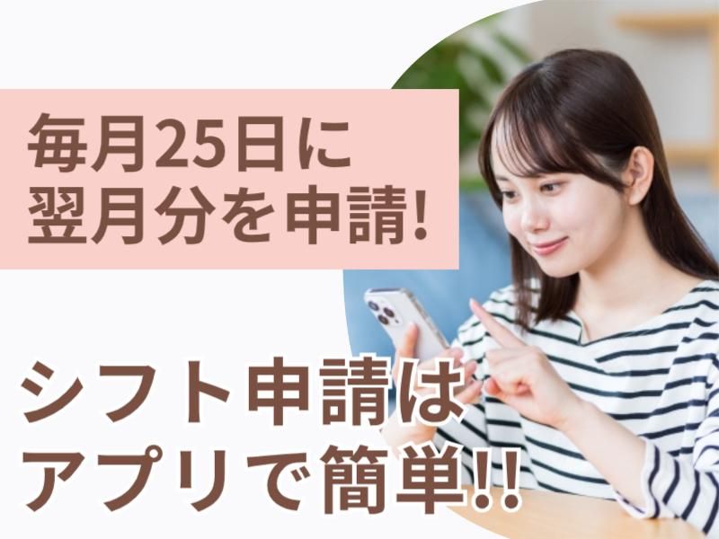 勤務時間詳細 <勤務時間> 17:00~21:00(実働4h) ※上記時間帯以外を希望の方、相談可能! ※シフトは毎月25日に翌月分の希望をアプリで送信! 送信後の変更も可能で、自分の予定や都合なども考慮した上で働ける♪