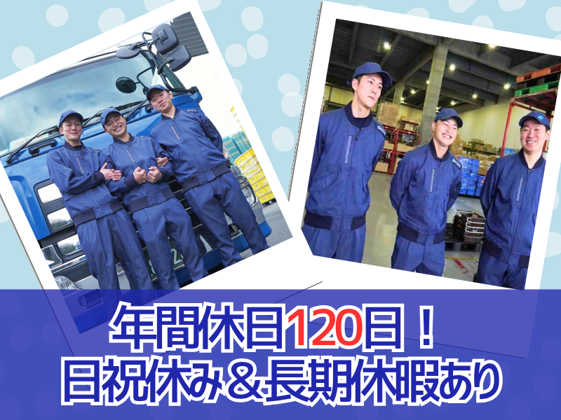 勤務時間・曜日: 08:30~17:30(実働8時間・休憩60分) ※残業は1日1~2時間程度 ---------------------------------- 【1日の流れ(例)】 08:00 出勤 08:15 積地へ移動 09:30 積込・配送 12:00 休憩 13:00 積込・配送 17:00 翌日の準備 17:15 車庫へ移動、お疲れ様でした!