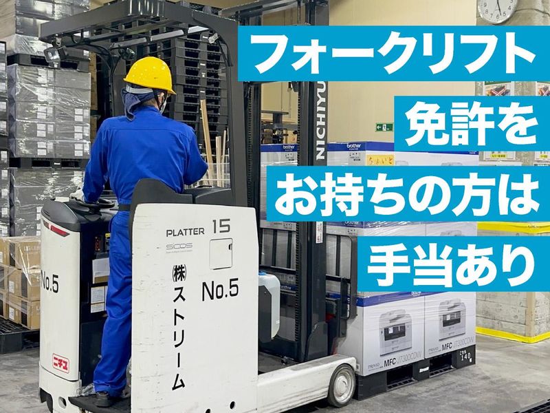仕事内容 ✨居心地の良さから長く続ける方多数✨ 今回が初めての公募になります! 特別なスキルも経験も一切必要なし♪ ✅高い定着率の理由は…「人」!  ̄ ̄ ̄ ̄ ̄ ̄ ̄ ̄ ̄ ̄ ̄ ̄ ̄ ̄ ̄ ̄ 責任者をはじめ、リーダー層も フランクで話しやすい人ばかりで、 皆さんとってもスタッフ思い。 責任者Nさんは現場との距離感が近く、 一緒に頑張ろうと思えるような熱血タイプ! (スタッフ談) 作業は一つ一つ進めるものが多いですが、 仕事についての相談など、 スタッフ同士で話す機会も結構あります。 そんな雰囲気の良さを気に入って、 15年以上続けてくれている方も! 数年前に倉庫移転があった際、 ついてきて続けてくれた方も多いんです♪ ✅親子で働く主婦スタッフMさんの声  ̄ ̄ ̄ ̄ ̄ ̄ ̄ ̄ ̄ ̄ ̄ ̄ ̄ ̄ ̄ ̄ ̄ ̄ 最初は生活のために週4日の派遣として 働きはじめたのがキッカケです。 職場の雰囲気が良かったので 正社員になり、それから十数年… 今では息子も同じ職場で働いています! シフトの相談はしやすいですし、 子どもの発熱時などの急なお休み希望や 保育園との兼ね合いでの時間調整など… しっかり融通を利かせていますので、 主婦(夫)さんも働きやすいと思います。 【⏩業務内容】  ̄ ̄ ̄ ̄ ̄ ̄ ̄ ̄ 家電製品、化粧品を扱う倉庫での 軽作業をお任せします。 ▼ピッキング&一次検品 台車と伝票を準備 ↓ 伝票を見ながら 該当の商品が入っている棚へ ↓ 商品を確認し、 ハンディでスキャン ↓ 台車に乗せる ※間違っていればハンディに エラーが出る仕組みになっています。 ▼二次検品 合う大きさの段ボールを作る ↓ 緩衝材をひく ↓ 商品を読み込んで段ボールの中へ ↓ 伝票と一緒に梱包用のレーンに流す ▼梱包 段ボールに入っている商品と 伝票が合っているかを目視で確認 ↓ 緩衝材を入れる ↓ 段ボールをテープでとめる ↓ 送り状を貼ってレーンに流す ✨徐々に慣れていけます♪ 最初は比較的簡単な梱包からお任せ! 2週間を目安に作業を覚えていただき、 ピッキングや検品もお願いしていきます。 ✧株式会社ストリーム 物流部について  ̄ ̄ ̄ ̄ ̄ ̄ ̄ ̄ ̄ ̄ ̄ ̄ ̄ ̄ ̄ ̄ ̄ ̄ ̄ 地域やお客様に近い存在として、 安心と信頼の物流を届けています。 お客様の「こうしたい」をカタチにする。 そんな柔軟なサービス対応が私たちの強みです。 そんな私たちと一緒に、 新しい風を吹かせてくれる仲間をお待ちしています!