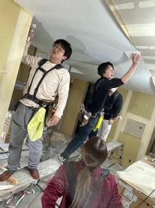 新築物件中心に壁紙を貼る現場スタッフ