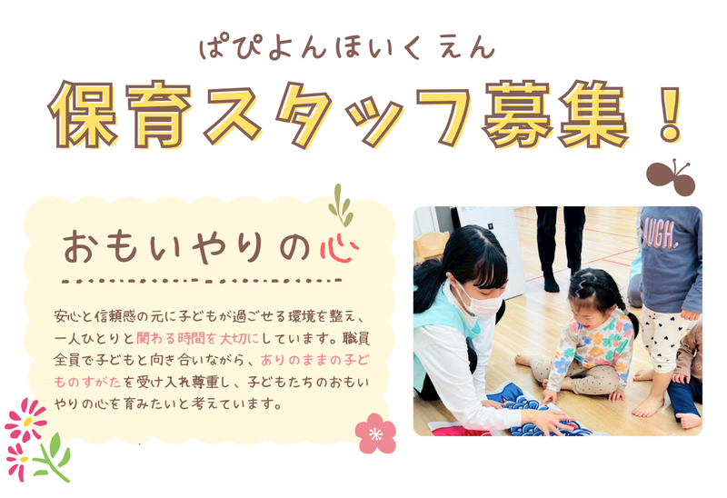 仕事内容 *企業主導型保育園 ぱぴよん保育園千代園* ┏ ──────────── ┓ 保育スタッフさんを募集★ ┗ ──────────── ┛ 子どもの成長をお手伝いしたい方、 子どもが好きな方大歓迎です! 園内補助業務をお任せします★ ◇調理補助・保育補助◇ 働きやすさ◎ここがポイント♪ ━━━━━━━━━━━━━━━━━ *定員は34名 *開園時間は7:00~18:00 ※延長保育19:00 *住宅手当などの各種手当が充実! ※社内規定あり 当園の魅力ついて ━━━━━━━━━━━━━━━━━ 当園は、一人ひとりに寄り添った 無理のない保育を行っております。 木の温もりあふれる園内は、 ワンフロアで職員の目が行き届く 工夫がされています。木の温もりを感じ 『自然に触れ合う環境』でのびのび育ち、 教育・食育・色育・飼育など『育み』 ながら想像力を豊かに成長していく。 絵本を通じ、好奇心、聴く力、集中力、 感受性を豊かにし、子どもらしさと 知性を磨く保育園です。 小規模保育のメリット ━━━━━━━━━━━━━━━━━ 子どもたちには担任職員がつきますが ワンフロアになるので、職員全員で 子どもたちを見守れる環境になって いるので安心です★ 現在活躍中のスタッフが 当園を選んだ理由を聞いちゃいました♪ ━━━━━━━━━━━━━━━━━ 保育に対しての想いが強いと感じました。 他の保育施設で働いてきましたが、 ぱぴよん保育園の保育に対する考え方や 子ども達一人一人に向き合いたい思いに 共感して、小規模保育という環境の この園を選びました。 <入社後の流れ> ━━━━━━━━━━━━━━━━━ 入社 ▼ まずは当園の1日の流れを お教えいたします。 園の年間や季節行事などを含め、 1か月間の流れ、1年間の流れと スケジュールを覚えていただきます。 ▼  ̄ ̄ ̄ ̄ ̄ ̄ ̄ ̄ ̄ ̄ ̄ ̄ ̄ ̄ ̄ ̄ ̄ ̄ 調理経験があれば資格不問です♪ 保育補助業務もお願いしますので ”子育て支援員”をお持ちの方大歓迎です! もちろん、見学のみでも大丈夫ですよ☆ スタッフ一同、ご応募をお待ちしています!