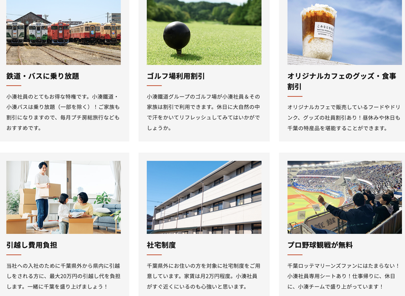 【保険制度】 雇用保険、労災保険、健康保険、厚生年金 待遇・福利厚生 【福利厚生】 ・賞与年2回(7月・12月/計3.0カ月分※前年度実績) ・交通費規定内支給 ・各種社会保険完備 ・小湊鉄道無料パス支給 ↳小湊鉄道全線、小湊バス(高速バス除く) ・千葉ロッテ(観戦無料) ・グループ会社ゴルフ場 プレー料金優待あり ・健康診断(年2回) ・保健師、看護師常駐 ・退職金制度あり