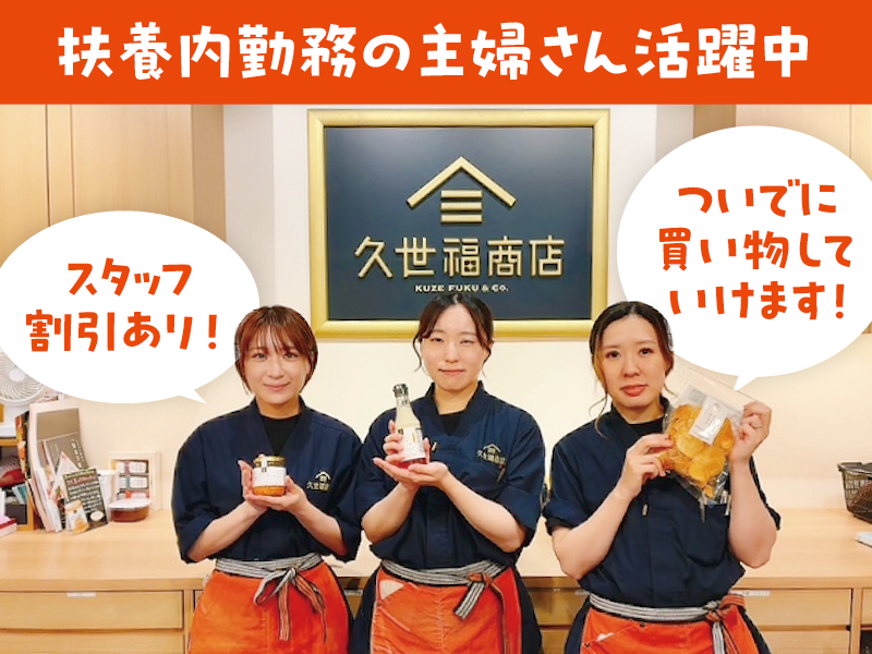 仕事内容 日本の“うまいもの”をお届けする「久世福商店」。 こだわりの品々をお客様にご案内しませんか? ――――――― ここがポイント ――――――― ◎週3日・1日5時間~、扶養内やWワークもOK ◎食卓が豊かになる♪嬉しい従業員割引あり ◎土日祝は時給100円UP! ◎20代~40代の女性スタッフが活躍中 ―――――――― 具体的な仕事内容 ―――――――― ・レジ会計・接客 ・ギフト包装・商品提供 ・商品整理、陳列、補充、在庫管理 ・店内清掃など 販売職未経験の方でも活躍できるように、 先輩スタッフが教えます! 応募前に不安がある方はお問い合わせもOK ―――――― よくある質問 ―――――― 【Q1】商品を覚えられるか心配… 【A1】陳列や掃除をしながら、少しずつ 覚えていけば大丈夫です!困ったときは先輩に 声をかければOK! また、商品検索システムがあるので安心です。 【Q2】シフトの相談をしたい 【A2】面接時に働き方の希望を伺っています。 子育て中の方、フルタイムで働く方など様々。 1か月ごとの希望シフト制なので 予定は組みやすいですよ! その他、お気軽にご相談くださいね。 【Q3】面接の前に見学できる? 【A3】もちろんです。 職場見学で雰囲気を確認したり、 質問したりできます。 不安な点を解消してから応募を判断できるので まずは気軽にご応募ください。 (見学希望の旨をお伝えください) 【Q4】「久世福商店で働いていて良かった」と感じる瞬間は? 【A4】 大学生などの若年層が多く活気がある職場で、世代が近く馴染みやすいのが魅力です。 また、試食や試飲の提供を通じて、 お客様と「これ美味しいですよね!」と 味の共感を分かち合えたときは、 この仕事ならではの楽しさを感じます。 【Q5】職場の雰囲気やチームワークについて教えてください。 【A5】 20代〜40代の女性スタッフが中心で、平均年齢は32歳です。 年齢の近いメンバーが多いので連携もスムーズ。 入社年数の長い先輩スタッフもしっかりフォローしてくれるので、 安心してお客様対応に取り組めるチームワークの良さがあります。 【Q6】接客の中で、特にやりがいを感じるのはどんな時ですか? 【A6】 ギフト選びを任せていただき、ご提案した内容を喜んでいただけた時は本当に嬉しいです。 また、自分が提供した試食・試飲をきっかけに 「美味しいから買うわ」と購入に繋がった瞬間は、 大きなやりがいになります。 【スタッフに聞きました!】 ■POP担当のAさん 新しいPOPを考える時は、「この商品の魅力は?」「どんな色なら目を引くかな?」とアイデアを出し合いながら作っています。 自分が作ったPOPを見てお客様が商品を手に取ってくださった時は、本当に嬉しい瞬間です。 日本の“うまいもの”に囲まれているので、美味しいもの好きな方にはぴったりの環境。 人気商品の情報もいち早くキャッチできるのは、スタッフならではの特権ですね。 ■もともと久世福が好きで応募したBさん もともと『久世福商店』の商品も雰囲気も大好きで、求人を見つけてすぐに応募しました。 採用が決まったことを友人や家族に話したら、「あのお店、私も好き!」と喜んでくれました。 お客様から「この商品、大好きなの」「お店の雰囲気がいつもいいね」と温かい言葉をいただくと、この仕事を選んで良かったと心から嬉しくなります。 残業もほとんどなく、仕事終わりの予定も立てやすいので、プライベートと両立しやすいのも魅力です。 これからも、お客様が笑顔でお帰りいただけるような、素敵なお店創りを続けていきたいです。