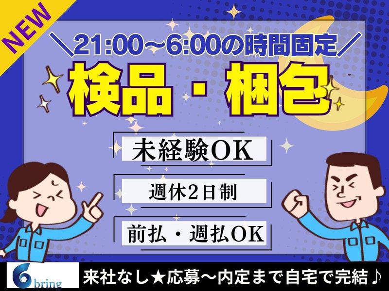 仕事内容 印刷工場での製品検査・夜勤専属 大手印刷工場で印刷物の品質チェックをお任せします。 【具体的な作業】 出来上がった印刷物を目視で確認していただきます。 ・印字のズレはないか ・インクの汚れはないか ・用紙の折れや破れはないか これだけです。特別なスキルや知識は不要。 先輩スタッフが横について丁寧に教えるので、 製造経験がなくても安心してスタートできます。 【作業環境】 空調完備のクリーンな工場内での作業です。夏も冬も快適に過ごせます。 【なぜこの仕事を選ぶのか」 ・夜勤だから昼間は自分の時間 ・21時出勤、朝6時退勤。昼間は完全にフリー。 ・友達と遊ぶ、趣味に没頭する、ゆっくり寝る。どう過ごすかはあなた次第です。 月収例:30万5,550円+交通費 基本時給1,400円 深夜帯(22時~5時)は時給1,750円 前払い・週払いにも対応。急な出費があっても安心です。 その他の魅力 ・シフト制で希望休を考慮(毎週土日休み希望は不可) ・車・バイク・自転車通勤OK ・残業は月15時間程度