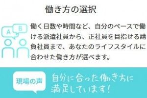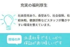 インフォメーション 未経験の方でも安心して始められるスキルアップトレーニングあり! 今イチオシの求人案件です。 アピールポイント 〇 土日お休み …プライベートの予定が立てやすく ワークライフバランスを取りながら メリハリをつけて働けます。 〇 高収入・厚待遇 …手厚い待遇で 頑張るあなたを応援します 月収36万円も可能だから ガッツリ稼ぐこともできます! 〇 直接雇用制度あり …6ヵ月以内に10名の直接雇用実績あり◎ 腰を据えて長く働きたい方必見! 〇 前払いOK …急な出費があっても対応です。 〇 交通費支給 …遠方からの通勤でも 負担が少ないです 〇 工場見学OK …働く前に事前に見学できるから 不安も解消できます! 〇 未経験の方でも安心して始められる スキルアップトレーニングあり! 〇 安全第一の職場でスピードを求められたり 忙しく作業する事はありません。 自分力バロメータ 協調性 柔軟性 責任感