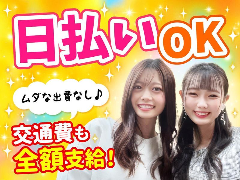 【保険制度】 雇用保険、労災保険、健康保険、厚生年金 待遇・福利厚生 【福利厚生】 ⭐ 嬉しいポイントいっぱい♪  ̄ ̄ ̄ ̄ ̄ ̄ ̄ ̄ ̄ ̄ ̄ ̄ ̄ ̄ ◆日払い・週払いOK(※規定あり) ◆交通費全額支給 ◆友達紹介で3万円プレゼント ◆髪色・ネイル・ピアスOK◯ (※店舗による) ◆冷暖房完備の快適な店内 ⭐ 時給UPキャンペーン実施中  ̄ ̄ ̄ ̄ ̄ ̄ ̄ ̄ ̄ ̄ ̄ ̄ ̄ ̄ ◆月1回の日曜は時給1,800円 ◆フルタイム勤務で日収14,400円 (日曜限定) ⭐ 応募はラクラク♪  ̄ ̄ ̄ ̄ ̄ ̄ ̄ ̄ ̄ ◆履歴書不要 ◆電話面接OK (面接交通費もかかりません!) ◆友達同士の応募・面接もOK ⭐ スピード対応で即勤務OK!  ̄ ̄ ̄ ̄ ̄ ̄ ̄ ̄ ̄ ̄ ̄ ̄ ̄ ̄ ◆応募後すぐに電話面接OK ◆希望に合った店舗をご紹介 ◆最短で翌日から勤務可能!