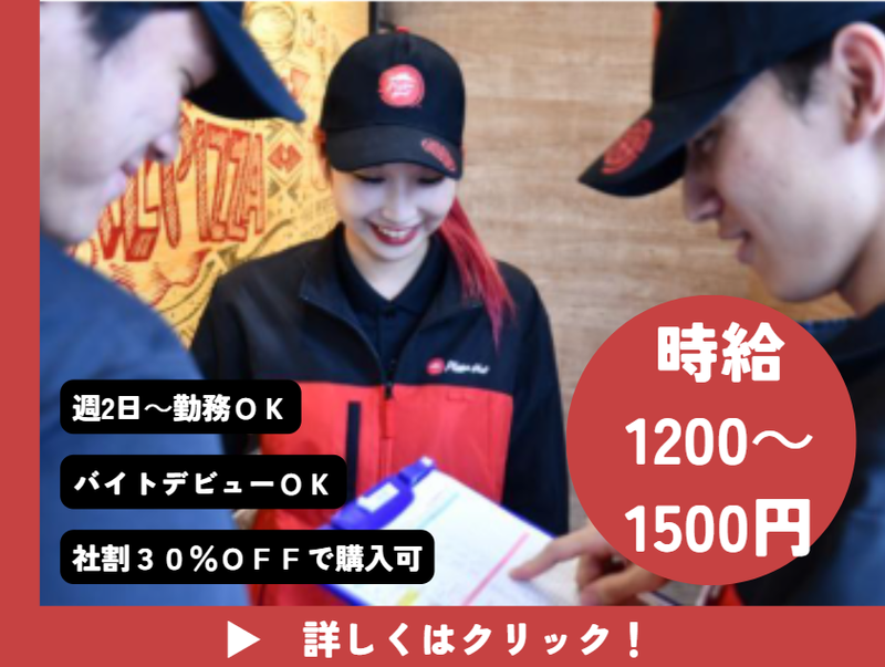 仕事内容 【スキマ時間でサクッと稼げる】 テレビCMでおなじみのピザハットで デリバリースタッフを大募集✨ *+:。.。:+**+:。.。:+**+:。.。:+* 嬉しい従業員サービスあり! ピザハット商品が30%OFF♪ 友人、兄弟など ”大勢”でのご応募も大歓迎★。・ *+:。.。:+**+:。.。:+**+:。.。:+* 【具体的には…】 自社バイクで出来立てのピザを お客様のご自宅までお届けします! 地図を見ながら 決められたエリアで配達! 配達エリアは小規模なので、 1ヶ月程度で覚えられます。 - ╭━━━━━━━━━━━━━╮ デリバリー経験なくてもOK! ╰━v━━━━━━━━━━━╯ マニュアル、動画研修で 事前予習もバッチリ! 最初は先輩と一緒に配達していきます! 配達ルートや接客の仕方なども 丁寧にお教えしますよ◎ ╭━━━━━━━━━━━━╮ 学校終わりやWワークに★ ╰━v━━━━━━━━━━╯ 《週2日~・1日3h~勤務OK!》 11:00~23:00内で、 あなたの希望の時間帯で働けます! 「学校終わりの夕方から夜まで」 「Wワークで夜の短時間だけ」 など働き方は自由自在! スキマ時間を見つけて、 サクッとお小遣い稼ぎ✨