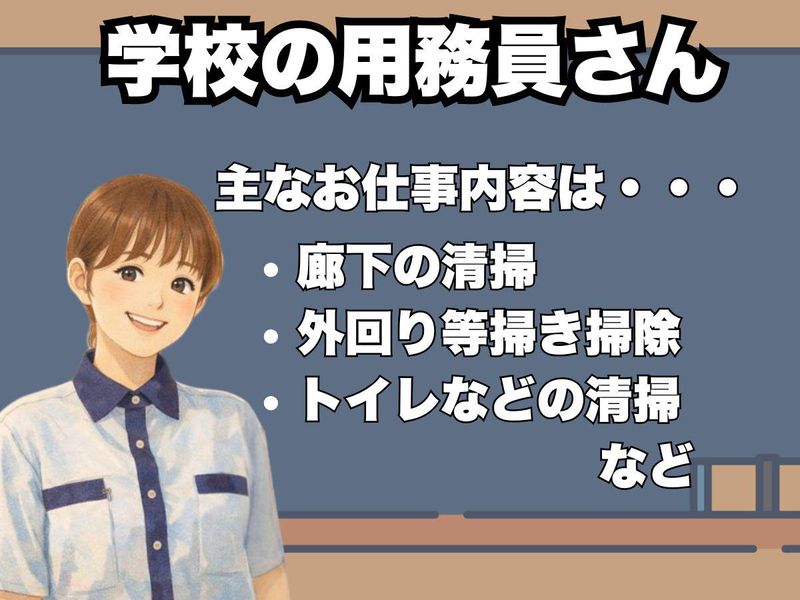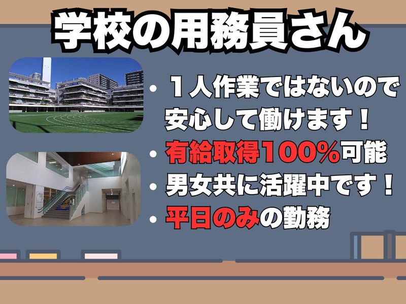 【保険制度】 雇用保険、労災保険、健康保険、厚生年金 待遇・福利厚生 【福利厚生】 ◆制服貸与 ◆交通費支給(規定内) ◆有給休暇(100%有給取得可) ◆自転車通勤可 ◆社員登用制度有 ・「未経験OK!マンション・ビル清掃経験が活かせる」 ・「異業種からの転職者も活躍中!」 経験ゼロから始められる ・「学校を支えやりがいのある仕事!」地域貢献しませんか? ・「設備管理・警備経験者歓迎!」スキルを活かして安定勤務が可能 ・「子育てが落ち着いた50代・60代の方も活躍中!」 ・「未経験スタートでも安心!」スタッフ先輩がしっかりサポート ・「安定した環境で長く働ける!」学校ならではの安心感