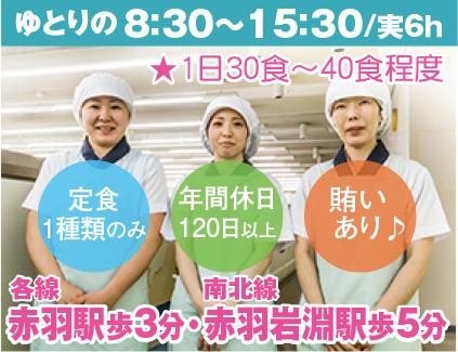 仕事内容 \働く方に楽しい食事を/ 安心の大手企業内!社員専用食堂♪ 【勤務地】駅チカ通勤楽々♪ 各 線/赤羽駅西口歩3分 南北線/赤羽岩渕駅歩5分 (北区赤羽2丁目) ◎調理スタッフさん募集! (調理経験等活かせます) <ここもポイント♪> 1日30~40食程度の調理です。 ★★定食1種類のみ★★ 【具体的には】 ・献立表に沿った昼食等の調理 (日替わり定食1種類) ・仕込み、盛付け、提供 ・簡単な事務作業など ◆ゆとりの勤務も人気! (月収/18万2160円以上可) 【勤務時間・曜日】 8:30~15:30/休1h・実6h ★月~金曜/週5日(祝休み) 【休日・休暇】 完全週休2日制(土・日・祝) GW・年末年始・他企業カレンダー ★年間休日120日以上でオフも充実♪ (お子様のいらっしゃる方にも大好評) 【社員食堂で働くメリット】 ✅働き易く安定した勤務時間♪ 社員食堂は企業の営業時間等に合わせて運営されており、中でも平日のランチタイムが中心です♪ ✅お客様は常連(社員やスタッフさん等) 社員食堂のお客様はその企業で働く社員やスタッフさんがほとんどなので、とてもアットホームな環境です♪笑顔いっぱいの「美味しかったよ~」「ごちそうさま」も大きなやりがいです♪ ✅嬉しい食事補助(美味しい賄い)♪ 昼食代節約&お弁当の手間も不要♪ ✅ご家庭での調理にも役立つスキル 調理方法や衛生管理の知識もゲット! ✅他、飲食業等とは異なる休日♪ 各企業等の休日と合わせる社員食堂がほとんどなので、土・日・祝日やGW・年末年始休暇もあるのが特徴です。 【当社概要】 ・企業事業所給食/首都圏約200店舗! ・ISO14001取得