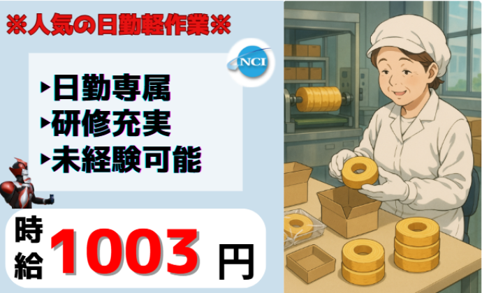 PR・職場情報 =====ここがポイント===== ■未経験で出来る工場内軽作業! ■日勤専属勤務でプライベート充実 ■お友達と一緒のお仕事OK! ■年齢不問 ==================== ◇NCIのここがオススメ!◇ ・手厚い労務管理で徹底サポート! ・社会保険完備!即日加入OK! ・誕生日プレゼントあり! ・未経験チャレンジャー引く手あまた! ◇こんな人にオススメ◇ ■製造業にチャレンジしたい方! ■丁寧に仕事を教えてほしい! ■コツコツした仕事が好き! ◇NCIのここがオススメ!◇ ▼社会保険にすぐ入れる!▼ 入社日当日から加入できます♪ ▼サポートバツグン!▼ 一人ひとりのスタッフさんに担当営業が付いて 就業を全力でサポート! ▼ほかにもたくさんの求人あり!▼ 実際にお話を聞いてみて「何か違うな・・・」と 思うところがあれば、別のお仕事のご紹介も可能です! まずはお気軽にお電話 or フォームからご応募ください♪ 求人の特徴 ■■■お仕事ポイント■■■ ≪工場、製造、食品系のお仕事をお探しの方オススメ≫ バームクーヘンを製造している工場で お菓子の包装や検品をしながらの 箱詰め作業のお仕事です! カットされたお菓子がコンベアに 流れてくるので、出荷用に包装、 梱包していく軽作業です! 食品系の工場勤務が初めての方でも 全然大丈夫!! 繁忙期につき複数名の増員募集なので お友達を誘って一緒のお仕事も! 就業時間は完全日勤のみ! 業務状況により残業は多少ありますが 働くママさんもしっかり活躍できる 長期安定の職場なんですよ! 就業してからも当社営業スタッフが しっかりフォローしますので 派遣が初めての方や 未経験のお仕事に不安のある方も 安心してお勤めいただけます!! ===こんな方にオススメ=== ■経験がなくてもやれる軽作業希望! ■コツコツとした作業がしたい! ■友達と一緒に働きたい! ■工場系の仕事に興味がある! =================== 40代、50代、60代の方が多く活躍中! お仕事についてのお問合せだけでも お気軽にどうぞ!! ■■■ここもチェック!■■■ ◇未経験者歓迎 ◇有資格者歓迎 ◇フリーター歓迎 ◇U・Iターン歓迎 ◇ブランクOK ◇週4日以上OK ◇長期 ◇髪型・髪色自由 ◇残業月20時間以下 ◇友達と応募OK ◇家庭都合休OK ◇40代以上応募可 ◇50代以上応募可 ◇60代以上応募可 ◇長期休暇あり ◇学歴不問 ■■■■■■■■■■■■■■ - この求人以外に派遣・バイト・アルバイト・パートや軽作業、 製造、事務のお仕事に興味のある方、短時間、短期・長期歓迎です。 郡山市、須賀川市、本宮市、田村市、小野町、二本松市でお仕事をお探しの方、 未経験、ハローワークでお探しの方もお問い合わせください。 - 〒961-0908 福島県白河市大手町12-1 駅前田部井ビル2階 株式会社 NCI 白河支店 電話番号:0120-744-555 (※お電話にてご応募の際は「求人サイトを見て」とお伝えください!) 一般労働者派遣事業許可番号:派07-300732 職業紹介事業許可番号:07-ユ-300310 求人ポイント シニア応援,社員登用あり,残業なし,交通費支給,即日勤務OK,主婦・主夫歓迎,長期,フリーター歓迎,バイク通勤OK,給料前払いOK,学歴不問,車通勤OK,転勤なし,未経験者歓迎,経験者歓迎,リモート面接OK,研修あり,社会保険完備,制服貸与,50代以上応募可,ブランクOK,育休制度あり,U・Iターン歓迎,家庭都合休OK,禁煙・分煙,長期休暇あり,40代以上応募可,第二新卒歓迎,産休制度あり,週5からOK,産休・育休取得実績あり,固定時間制