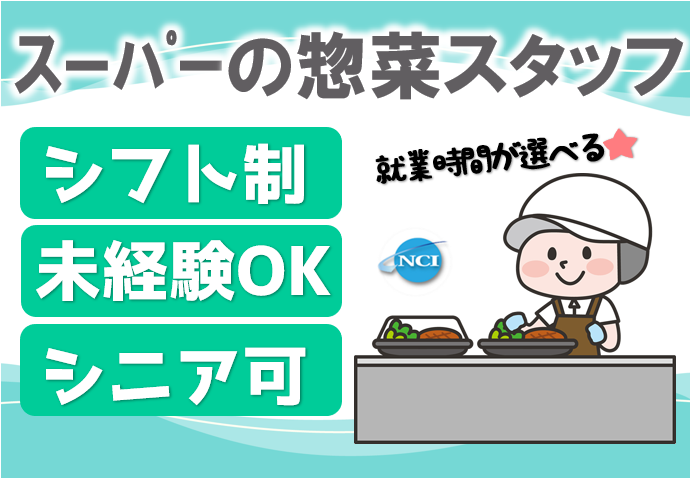 PR・職場情報 ===このお仕事のポイント!=== ■未経験OKの惣菜部門のお仕事! ■都合に合わせて働ける! ■大手スーパーで長期安定! ■週5日シフト制!※日数相談可 ■年代問わずシニアも活躍! ====================== ▼安心のフォロー体制▼ 就業してからも当社営業スタッフがしっかりフォローしますので、派遣が初めての方や未経験のお仕事に不安のある方も安心してお勤めいただけます!! ◎お仕事内容のお問合せだけでもお気軽にどうぞ!! 求人の特徴 【お仕事開始までの流れ】 STEP1: 営業社員との面談、登録 STEP2: 職場見学 STEP3: 入社書類取り交わし STEP4: お仕事開始 ※平日18時以降の面談やオンライン対応も可能です。ご希望の方は遠慮なくお問い合わせください! - この求人以外に派遣・バイト・アルバイト・パートや軽作業、製造、事務 のお仕事に興味のある方、短時間、短期・長期歓迎です。 長岡市、小千谷市、見附市、三条市、燕市、柏崎市でお仕事をお探しの方、 未経験、ハローワークでお探しの方もお問い合わせください。 - 〒940-2026 新潟県長岡市堺東町37-1 高野不動産堺ビル205 株式会社 NCI 長岡支店 TEL:0258-84-7800 FAX:0258-84-7814 freedial:0120-78-2345 (※お電話にてご応募の際は「求人サイトを見て」とお伝えください!) 一般労働者派遣事業許可番号:派07-300732 職業紹介事業許可番号:07-ユ-300310 kyo 求人ポイント シニア応援,交通費支給,即日勤務OK,駅から5分以内,主婦・主夫歓迎,長期,フリーター歓迎,バイク通勤OK,給料前払いOK,学歴不問,車通勤OK,残業月20時間以内,転勤なし,未経験者歓迎,リモート面接OK,社会保険完備,制服貸与,50代以上応募可,ブランクOK,育休制度あり,U・Iターン歓迎,家庭都合休OK,禁煙・分煙,シフト制,40代以上応募可,産休制度あり,髪型・髪色自由,週5からOK,産休・育休取得実績あり