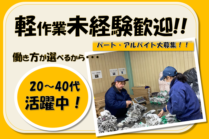 仕事内容 《ポイント♪》 ✅女性活躍中のカンタン軽作業 ✅平日のみ*1日3h~OK! ✅週3日~5日で応相談*扶養内勤務可 ✅創業55年の安定企業◎ ✅職場見学OK ✅社員登用制度あり ・・・・・・・・・・・・・・・・・・・・・・・・・・・・・・・・・・・・・・ 【 仕事内容✨ 】 クリーニングしたタオルや手袋を 畳んだり、袋詰めしたりするお仕事。 洗い上がったらタオルや手袋を 乾燥機に入れる工程もお願いします。 【 未経験・女性も活躍中✨ 】 未経験からはじめた 20代~40代のスタッフが活躍中! 家事や育児と両立して働く 主婦スタッフさんも在籍しています。 【 働きやすい平日のお仕事✨ 】 平日9時~17時の間で3h以上から可能◎ フルタイムで勤務したい方も歓迎! 希望の勤務日を申告できるから 子育て世代の主婦・主夫さんや Wワーク希望のフリーターさんに最適☆ 【 安定の日本ウエストン✨ 】 当社は創業55年。 無借金経営を続け安定性抜群です! この度、事業拡大につき スタッフを増員募集します! ▼ホームページはこちら https://www.weston.co.jp/