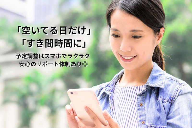勤務時間・曜日: 8:00〜20:00の間で2〜6時間程度の案件が中心です。ご自身の予定に合わせて勤務可能な案件をご案内します。