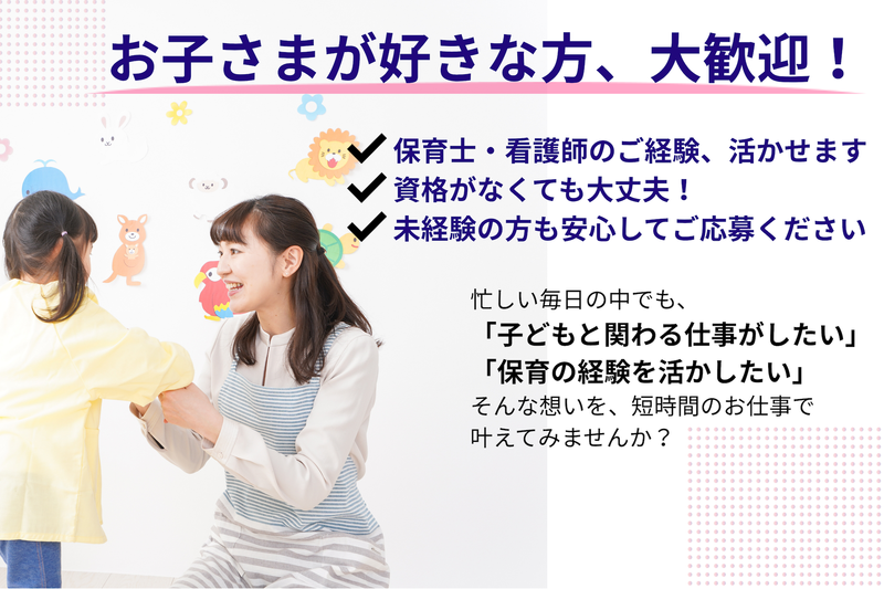 アピールポイント: ■ 事務局としっかりつながれる環境 当社は、シッターと事務局が密に連携しながら運営しています。 現場で感じたことや改善提案なども気軽に共有でき、実際にサービス改善に反映されています。 「ただ働くだけでなく、一緒にサービスをつくる」実感を持てる環境です。 ■ LINEで気軽にやり取り 案件のご案内や日々のやり取りはLINEが中心です。 困ったときや相談もすぐにできるため、安心して働くことができます。 ■ 柔軟な働き方 週1日〜OK。副業・Wワークの方も多数活躍中です。 送迎のみの短時間の案件もご案内しています。 ■ 未経験でもスタート可能 研修制度があるため、未経験の方でも安心して始められます。 ■ 経験・資格が活かせる 保育士・看護師・助産師資格や、シッター経験・子育て経験のある方は優遇します。 ■ 希望者は運営にも関われる ご希望や適性に応じて、在宅での運営業務(連絡対応・調整など)にも関わることができます。 サービスを支える側の視点も経験できるのが特徴です。