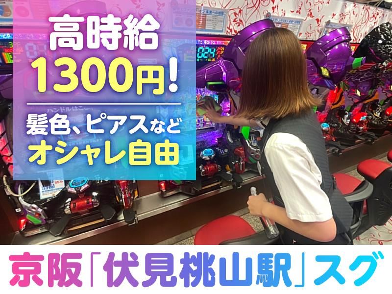 仕事内容 -この求人のPOINT- ★伏見桃山駅から徒歩1分の好立地 ★高時給1300円!深夜はさらに時給UP ★髪色、ピアスなどオシャレ自由! ★販促物の企画/制作にも携われる! - 主に店内巡回や景品交換等の カウンター業務です。 パチンコ全台が各台計数機設置店で、 「重い玉を運ぶ」なんて昔の話です。 力仕事もなく、男女ともに しっかり活躍いただけます。 マニュアルもありインカムを通じて、 常にみんなが指示やフォローが出来る環境で 経験が無くても不安なく業務できます。 【具体的な仕事内容】 ・店舗を巡回してお客様のお困り事への対応 ・景品交換などのカウンター業務 ・在庫管理などのバックヤード業務 ・遊技台や設備の点検整備 ・店内清掃 ■販促物の企画/制作にも携われる! あなたの得意なことを活かして ・店内広告/販促物の制作 ・集客面の企画立案 ・SNSでの情報発信 などの業務に携わることも可能です◎ 店内の販促物などは「Illustrator」を使用。 DTPスキルも身に付きます。 (DTP経験者はそのスキルを活かせます) ■未経験の方も安心スタート! 約5日~1週間程度は先輩スタッフがつきっきりでお仕事を教えます。 一つひとつ丁寧にサポートしますので、 パチンコを知らない方や接客未経験の方も 安心してスタートしていただけます◎ ■CENTER(センター)について 京阪「伏見桃山駅」からスグの 大手筋商店街の中にある、 地域密着型の小規模なお店です。 お客様は常連様やご年配の方が多いため、 スタッフ同士のチームワークを大事にしています。