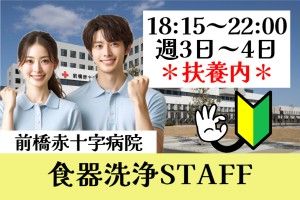 インフォメーション 《夕方からの短時間/18時15分~22時/週3日~4日》午後から出勤だから朝はゆっくり!空いた夕方時間を有効活用して収入アップ◇扶養内! ~ 総合病院でのお仕事です ~ 《前橋赤十字病院》 入院している患者さんが使用した食器類を片付けるお仕事です 食器を洗うのは、食器洗浄機を使用します 学歴不問・資格不問・経験不問・無資格OK 未経験・初心者OK 安定の長期歓迎 無理なく働ける週3~4日の固定時間・固定シフト制 夕方18時15分~午後のみ+時短勤務のパート 残業なし+扶養内勤務OK ワークライフバランスばっちり◎ プライベートタイムも充実できます♪ シニア応援☆ミドル活躍中 中高年・ミドルシニア・アクティブシニア活躍中です ☆とても清潔できれいな病院です アピールポイント ◎午後のみのお仕事 ◎WワークOK・副業OK ◎週3~4日のシフト勤務 学生・主婦(夫)・ミドル・シニア活躍中 丁寧に指導しますので、 初めての方も安心してご応募下さい♪ \ ご応募お待ちしております /