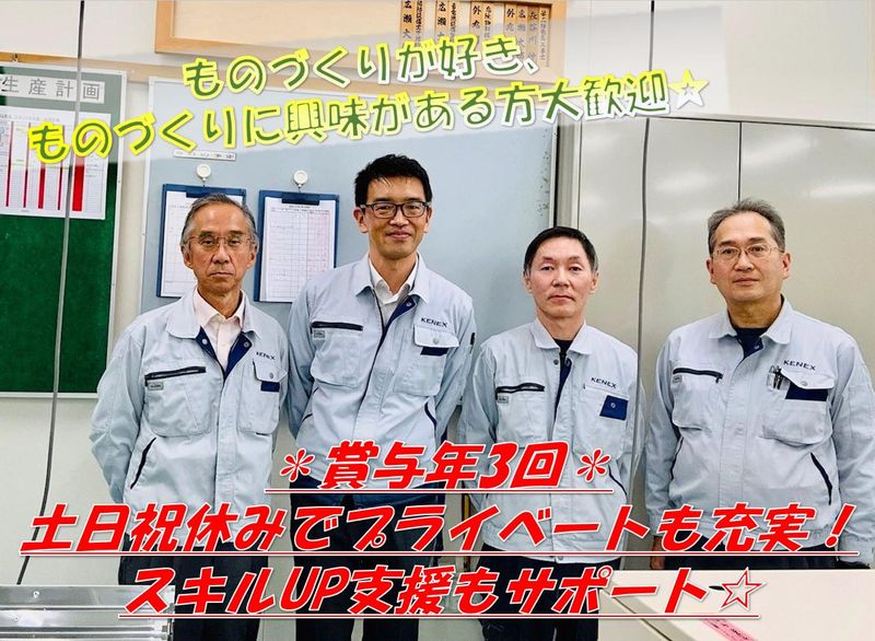 仕事内容 ✅【求人のポイント】―― ★未経験OK!9割以上が未経験スタート◎ ★年休112日!長期連休もありプライベートと両立◎ ★賞与年3回!残業月平均10h程度で働きやすい環境◎ ★UIターン希望の方には引越し手当支給(上限30万) ★スキルアップや資格取得もサポートしてます◎ ――――――――――――――――――― ケネックスは『メカトロニクスの コンビニエンスファクトリー』を標榜して おり、お客様の希望をカタチにしていく 「“便利”なものづくり屋」として、 業務用厨房機器や温浴循環器などの産業用 製品の製造開発を行っています。 設立より順調に業績を伸ばし成長しており、 今後を見据えた組織体制の強化を図るべく、 新しい仲間を募集いたします! 今回募集するのは組立工。 お客様の製品や装置を完成品にまで組み立て を行う正社員です◎ 未経験の方はゼロから育てていきます ので、まずはお気軽にご応募ください♪ ✅【業務内容】  ̄ ̄ ̄ ̄ ̄ ̄ ̄ ̄ ̄ ̄ ̄ ̄ ̄ ̄ ̄ ̄ ̄ ̄ ̄ 私たちのモノづくりは3つです。 ◇小ロットの業務用製品(銀行やホテル、 厨房や各種機関、施設で使用される製品) ◇搬送装置などの産業用機器の 組立・機体配線の完成品組立 ◇自社製品の業務用浴用循環器 実際に行ってもらう仕事としては、 ドライバーなどの工具を使用してネジ締め や配線を行います。 最初は実務の実践を行い経験を積みながら、 作業計画や段取り、工程指導など完成品に するための仕事範囲を広げていきます。 組立てした製品の検査や梱包も行います。 *応募前見学やご相談も大歓迎です! 少しでも気になっていただけたら お気軽にご連絡ください。 部品単体ではなく、完成品(製品)に 仕上げる総合的なものづくりに取り組める 面白い仕事を一緒にしてみませんか? ✅【ある1日のスケジュール例】  ̄ ̄ ̄ ̄ ̄ ̄ ̄ ̄ ̄ ̄ ̄ ̄ ̄ ̄ ̄ ̄ ̄ ̄ ̄ 【8:15】始業・朝礼。 ▼ 【~8:30】その日のスケジューリング、工程の段取り。 ▼ 【8:30~】仕入部品の受入れ、整理整頓。 ▼ 【9:00~】組立指導、組立作業。 ▼ 【12:00~】昼休憩(60分) ▼ 【13:00~】組立作業・検査。 ▼ 【16:00~】梱包・出荷、次工程の準備。 ▼ 【18:00】退社。本日もお疲れ様でした! ✅【採用担当者にインタビュー】  ̄ ̄ ̄ ̄ ̄ ̄ ̄ ̄ ̄ ̄ ̄ ̄ ̄ ̄ ̄ ̄ ̄ ̄ ̄ Q:会社の魅力は何ですか? ――――――――――――― ・業績が安定しているので安心して働けること。 ・資格手当やキャリアアップ支援を積極的に行ってること。 ・未経験から活躍できる環境があること。 など、あげればきりがないですが、 仕事の魅力として感じているのは、 完成品を作っている会社なので休日に お店や施設に行った際に自分たちが作った物 が活躍している姿を見るとやりがいを感じます。 「あれ俺が作ったんだよ!」と誇らしい気持ちになりますね★ Q:やりがいや面白さは何ですか? ―――――――――――――――― 完成品まで組み上げる仕事なのでメカや エレキ、ソフトなどモノづくり全体的に 関われるのは面白いと感じます。 分かりやすく言うと「プラモデル」 腕だけ作るのではなく、その先も作りた くなりますよね! ゼロから形になるところまで製品を組み 上げるのは達成感にも繋がります。 完成してからスイッチを入れて初めて しっかり動くか分かるので完成後は ドキドキしています(笑) 自分の仕事が形になって、社会に出て いく姿をみれる。 命の火がやどる瞬間に立ち会えるのは この仕事の醍醐味だと思います。 Q:働くうえで大変なことは? ―――――――――――――― 少量多品種で最終製品の組立てを行っている ので、仕事を覚えていくことに時間がかかる ことが大変かもしれません。 反面、様々な業種・業態で使用される多様な 製品や装置の組立てに携われるので、飽きが こないですし、ものづくりが好きな人には 向いている仕事で働き甲斐があると言えます★ Q:求職者の方に伝えたいことは? ―――――――――――――――― 過去の実績は問わないので、 まずはやってみたいかが重要! 会社も求職者も対等な関係だと考えています。 なので遠慮なく意見や質問をぶつけてください★ 面接でお会いできることを楽しみにしております。 Q:どんな方が採用に繋がりやすいですか? ――――――――――――――――――― ものづくりに興味がある、ものづくりが好き。 そんな方からの応募をお待ちしております。