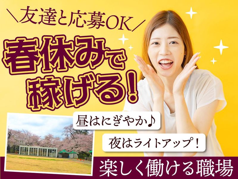 職場環境 重要文化財に指定された歴史ある施設での春限定イベント。約250本の桜に囲まれた開放的な環境で、学生・フリーター中心に活躍中。短期でも丁寧なフォロー体制があります。 喫煙所:喫煙所あり(屋外)