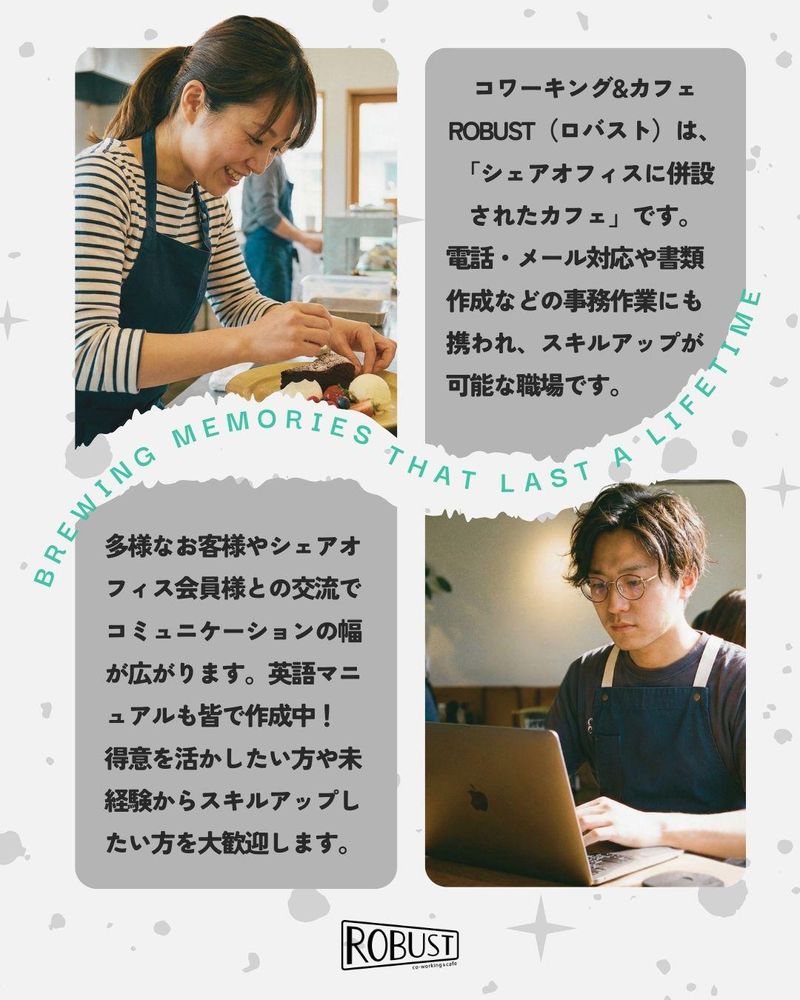 仕事内容 コワーキング&カフェ ROBUST(ロバスト)は、「シェアオフィスに併設されたカフェ」です。 そのため、接客や調理などのカフェ業務だけではなく、電話・メール対応や書類作成などの事務作業にも携われる点が他店とは違います。 メニュー考案やPOP作成、イベント運営等には、スタッフの意見も多く取り入れており、新人ならではの感性にも期待しています。 先輩スタッフや社員のフォローにより、接客やパソコン作業が未経験でも、業務を通じてスキルアップが可能な職場です。 [業務内容] ・開店/閉店作業(お掃除やBGMの設定など) ・接客対応 ・ドリンク作成、スイーツ作成、シロップ仕込み ・レジ操作 ・発注や納品管理 ・コワーキング管理 ・会議室予約対応 ・シェアオフィス環境整備・会員管理 ・会員管理(メールでの郵便物受領連絡・請求書送付等) ・POP作成、メニュー作製 ・SNS更新 ・動画マニュアル作成 等 ロバストは、お子様連れのご家族やご年配の方、海外からの観光客など、幅広い層にご利用いただいており、 シェアオフィス会員様のお客様対応も行うため、コミュニケーションの幅も広がります。 得意分野を活かしたい方、未経験のことに挑戦したい方、スキルアップを目指す方、大歓迎! 英語で接客するためのマニュアルも皆で作っているので、簡単な英語対応が出来るようになったスタッフも♪ 折角バイトするなら成長できる職場で!私たちと一緒に、ロバストを盛り上げてくれる方をお待ちしています。