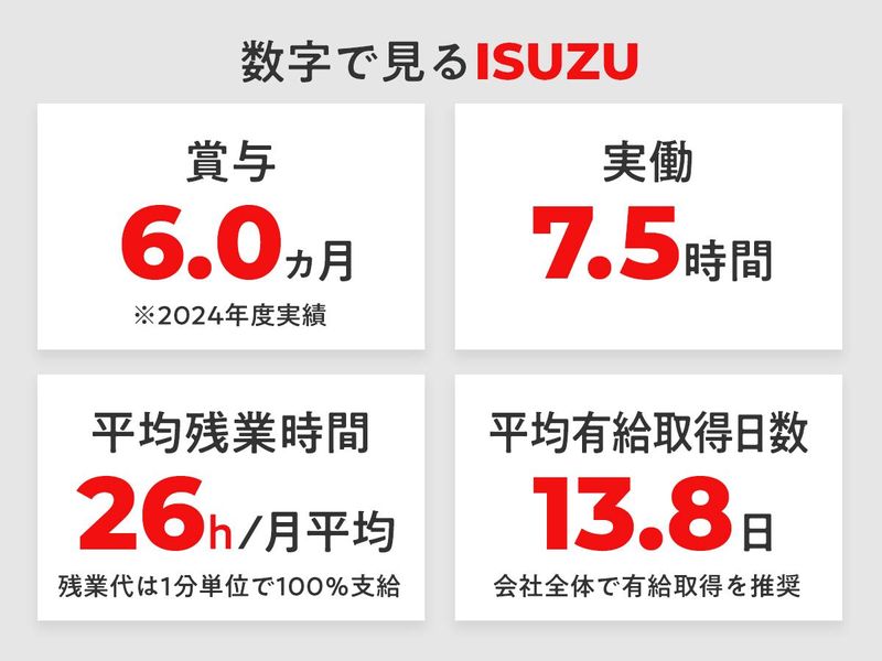 仕事内容 ISUZUの自動車販売・リース提案営業/既存顧客への提案がメイン◎ 【具体的には】 完成車~オーダーメイドトラックや ダンプカーなどの車両販売・リースの提案営業 ※既存顧客95%:新規5% ▼既存顧客へ訪問・提案 ▼電話・メール対応 ※反響・新規対応もあり ▼見積書作成などの事務業務 ▼整備スタッフ・架装メーカーとの打合せ ▼再提案 既存顧客へは新車や車検などのご案内が中心 見積書などはフォーマットがあるので安心です。 【オンリーワンの提案を!】 お客様がトラックで運ぶ荷物に合わせて”カスタム” 「ウィングボディの方が積込効率が上がりますか?」 「この荷物にはこの仕様が人気です。」など お客様と一緒にオリジナルトラックを 一緒に作り上げていく面白さがあります。 納車まで最短3ヶ月~最長2年★ ▼1日の流れ/例 <午前> ・見積書作成や電話対応などの事務作業 <お昼> 休憩60分 <午後> ・お客様先へ訪問 ┗商談の場合は1日3~4件 『いすゞ自動車中部』には 未経験からでも安心して活躍できる秘訣が沢山! そのPOINTを今からご紹介します★ ◆【01.イチから育てる充実の研修】 入社後はまず、“基礎の基礎”を学べる トラック整備の研修からスタート! トラックの仕組み等、 業務に必要な専門知識をお教えします◎ その後は先輩と一緒に実際の現場へ! 「どうやって商談を進めていくのか?」 「話し方のコツは?」など、 営業ノウハウを直接学ぶことができますよ。 あなたのペースに合わせて お任せしていきますので、 焦らず取り組んでいってくださいね* ◆【02.独自の提案しやすさ】 当社の強みは「ブランド力」と「サービス体制」。 国内外問わず人気があるほど、知名度は抜群! 多くの方に知られているからこそ提案もしやすく、 営業が初めてでも成約につなげやすい環境です◎ ◆【03.無理のない営業ができる】 営業スタイルは 既に購入意欲のあるお客様へ提案する形がメイン。 加えて飛び込み営業もないため、 安心してご活躍いただけます! \さらに/ ★実働7.5h×週休2日制 ★ノー残業デーあり ★直行直帰可能 ★2023年度有給取得平均12.6日 etc. 心にゆとりを持って取り組めますよ* \高収入も目指せます!/ 「やってみたい」という想いを歓迎! 成長はしっかりサポートしますので 安心して飛び込んできてくださいね◎