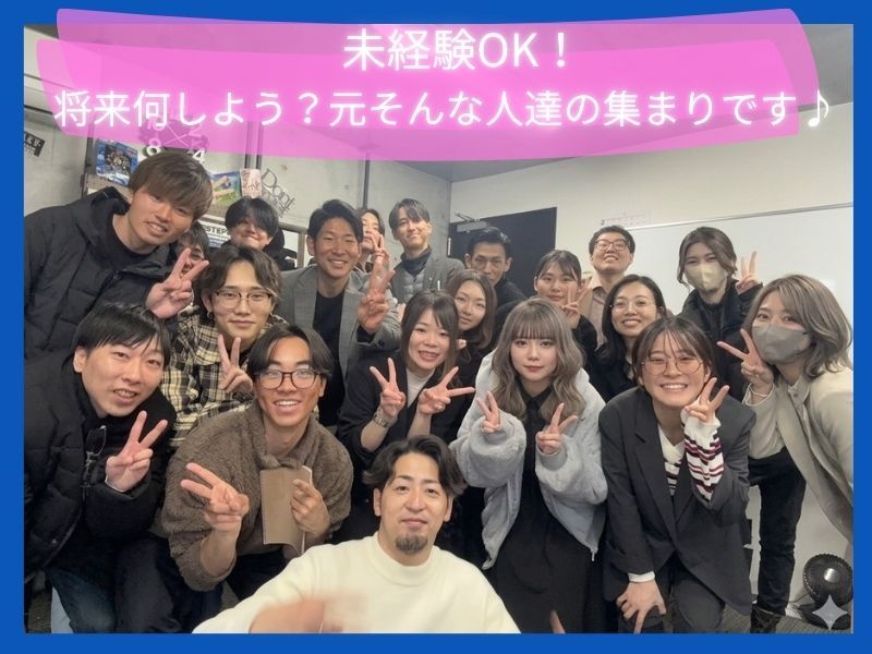 求める人材: ■代表からのメッセージ■ もしあなたが 「このままでいいのかな」 と一度でも思ったことがあるなら、 それは大きなチャンスです。 最初から やりたいことが決まっている人なんて ほとんどいません。 でも 環境で、人は変わります。 ここには 本気で成長したい仲間がいます。 あなたの人生を変える きっかけになる場所を 本気で用意しています。 【最後に】 将来なにしたいかわからない。 それ、普通です。 でも、 「何も変えない」ことが一番もったいない。 まずは一度、 話を聞きに来てください。 あなたの「これから」を 一緒に作りましょう。