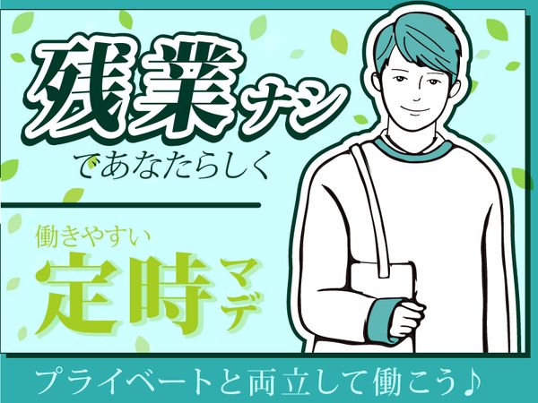 勤務時間 固定時間制 9:00~18:00 休憩時間 1時間 (12:00~12:50 15:00~15:10) *残業なし!定時退社OK!