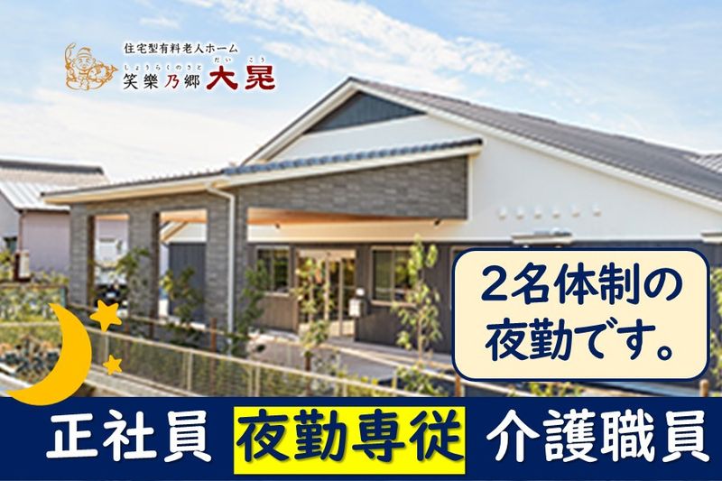 【仕事内容】 夜勤専従の常勤介護職員さん募集! 夜勤は2名体制!未経験の方も、ブランクある方も大歓迎です! \ブランクや自信が無い方も安心サポート充実/ 全員が自信を持って介護業務を一緒に頑張れるようサポートさせていただきます! ご利用者様に寄り添った柔和なケアができる環境です。 【PRポイント】 ・心からの感謝の言葉を貰えるお仕事です ・一人ひとりと向き合う寄り添った介護が可能 ・スタッフ間のチームワークと雰囲気の良さ! ・チームで支え合い、成長できる環境! ・夜勤も手当充実!働き方に合わせた柔軟な勤務制度! ・資格取得支援制度(費用補助・合格祝金)あり! ■具体的な仕事内容 住宅型有料老人ホームでの「夜勤専従」の介護スタッフさんのお仕事です。(2名体制の夜勤です) ・バイタルチェックやお薬管理など健康管理 ・利用者様の巡回と安否確認 ・介護記録 ・起床時の介助やお手洗い誘導 など ●住宅型有料老人ホーム 笑樂乃郷 大晃(しょうらくのさと だいこう) のびのびとできる自然に囲まれた全32床の平家建て住宅型有料老人ホーム。 「もっとやさしく、もっとたのしく、未来へつなぐ」を大切に、 ご入居者様はもちろん、会いに来てくださるご家族のみなさまもゆったりと過ごしていただける施設です。 自立した生活を行っていただくために、利用者様を尊重したサポートを実施しています。 ●介護施設未経験の方も、ブランクある方も大歓迎です 先輩スタッフが、一から丁寧にサポートします。ブランクのある方も、もちろん安心して働けます。 ●仕事とプライベート両方充実できます プライベートの時間も十分に確保でき、時間の有効活用が可能な職場です。 ●お気軽にお問い合わせください。 いきなりの面接は不安な方には施設見学も大歓迎です。 働き方の相談や、仕事内容のご質問などのお問合せもお気軽にご連絡ください。 入職時期が2、3ヶ月後の方も遠慮なく、施設見学承っています。先ずはメールでお問い合わせ下さい。 必要人員が採用出来次第、募集を締め切りますのでお早めにご応募お待ちしております。 【求人ID-DKS1】