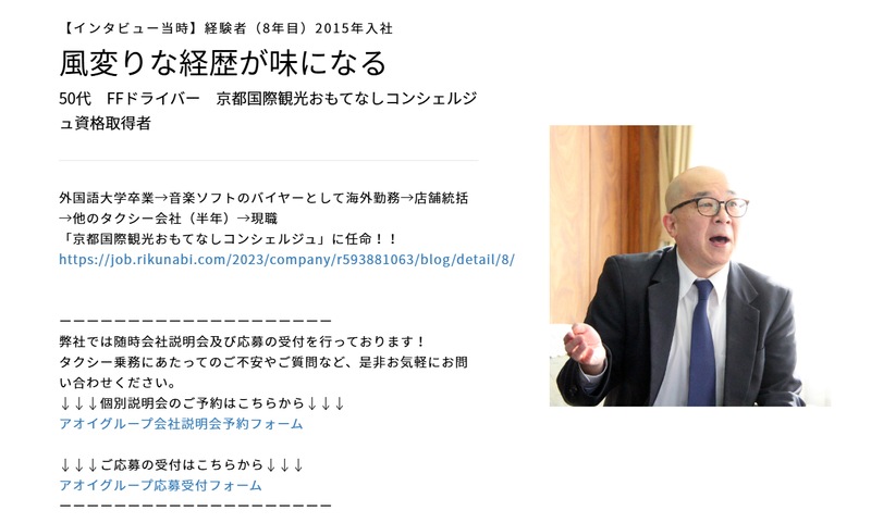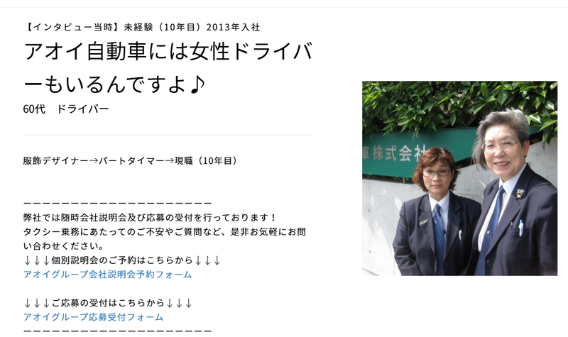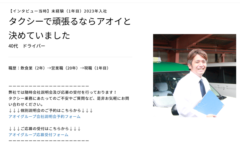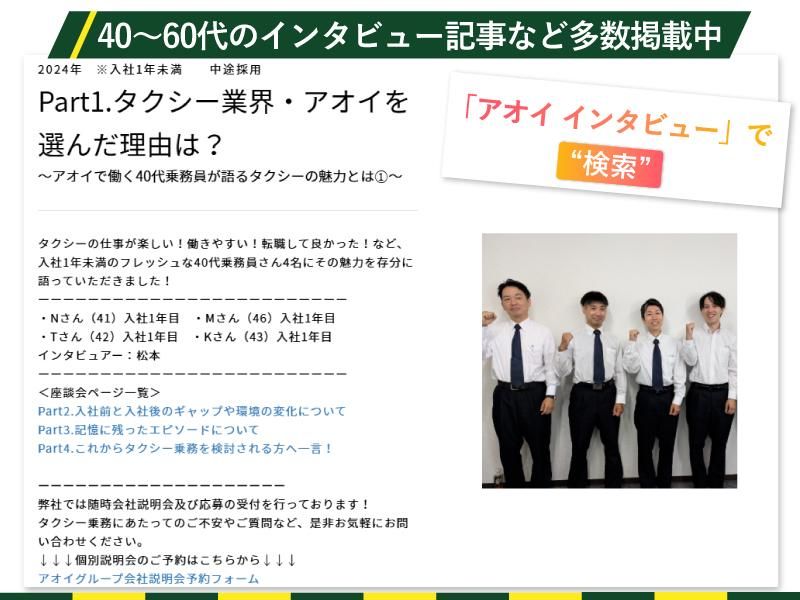 仕事内容 ―――――――――――――――――――― 人生経験が、最高のサービスに繋がる仕事があります ―――――――――――――――――――― アオイグループでは、幅広い年代のドライバーが活躍しており、40代以上の方々もそれぞれの経験とスキルを活かして第一線で働いています。 「この歳から転職なんて...」そんな不安を感じている方に届けたい。 前職の経験、人生で培ったコミュニケーション力、そして何より「人を大切にする心」が、すべて強みになる。 それがタクシードライバーという仕事です。 同世代・先輩世代のドライバーたちはどんな想いで転職を決意し、どんな日々を送っているのか。 3名のリアルストーリーをお届けします。 【新人からベテランまで約30名の乗務員インタビューを掲載中!】 https://recruit-aoi-group.com/interviews <今回ご紹介する40代・50代・60代の転職成功ストーリー> 【Case1】40代・「最後の転職」で自分の好きを仕事に 40歳を前に決断、接客と運転が好きな自分を活かす道へ 【Case2】50代・小売業界から観光タクシーのプロへ デスクワークへの違和感から一念発起、英語力を活かした新天地 【Case3】60代・女性ドライバーが見つけた地域貢献という誇り 運転好きが天職に、地域の見守り役として活躍する日々 ー ―――――――――――――――――――― 決断、挑戦、誇り~それぞれの転機~ ―――――――――――――――――――― 【「最後の転職」で自分の好きを仕事に】(40代・入社1年目) 転職のきっかけは、自分がやりたいことは『接客が好き』『車の運転が好き』であることもあり、最後の転職として自分の好きが実現できるタクシードライバを選びました。 -出入り業者として見ていたアオイの印象- 入社理由は、出入り業者としてアオイに訪問していた際の印象が決め手。 面接官の人柄や説明も丁寧で、やっぱりアオイ!と即決断しました。 ▼やりたい仕事と収入が両立できる、充実した日々、、、 続きはインタビューでページで! https://recruit-aoi-group.com/interviews/2570 ー 【小売業界から観光タクシーのプロへ(50代・入社8年目) 岐路になったのは40代。 前職の現場での仕事も一区切りがつき、そろそろ本部でのデスクワークの道が見えてきていました。 そんな既定路線のキャリアに「本当にこの道を進んだ先に自分の満足はあるのか?」と葛藤の末、退職を決めました。 -大手タクシー会社での失敗- 実はアオイ自動車に入る前に半年間だけ大手タクシー会社にいたんです。 ところが、労働時間は毎日20時間越え、サービスは基本マニュアルの徹底、人間関係はギスギスと、私が望んでいた働き方とはまったく異なる環境でした。 そんな中、アオイ自動車は「人間関係が良いらしい」という話を同僚からよく聞いており、そんな話を頼りに向かった面接では社員の方々が本当ににこやかな笑顔で私に接して下さり、「ここでお世話になりたい!」と確信したんです。 ▼スキルを活かす、 アオイで見つけた自分らしい働き方、、、続きはインタビューでページで! https://recruit-aoi-group.com/interviews/1641 ー 【女性ドライバーが見つけた地域貢献という誇り(60代・入社10年目) きっかけは単純ですが『車の運転が好き』だったから。 はじめは夫や子供たちから反対されるかな?とも心配しましたが、私の「やると決めたらとことんまで」という性格を察してくれていたのか、すんなりと送り出してくれましたね!(笑) -マニュアルを超えた「人」を大切にする仕事- 『やっとアオイが来てくれた!』そうお客様に喜んでいただけるのがアオイ自動車です。 ただただマニュアル通りにサービスを提供するのではなく、サービスの先におられる『人』を常に大切に。 まさに地域に愛され、地域の方々にご利用いただいている私たちだからこそできる社会貢献だと思っています! ▼ドライバー人生で一番誇りを持てた瞬間、、、 続きはインタビューでページで! https://recruit-aoi-group.com/interviews/1645