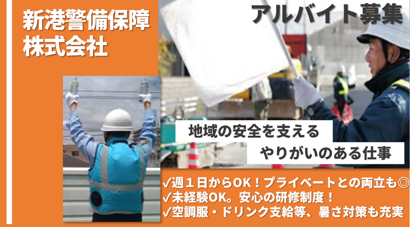 仕事内容 <アピールポイント>  ̄ ̄ ̄ ̄ ̄ ̄ ̄ ̄ ̄ ̄ ̄ ̄ ̄ ̄ ̄ ̄ • 未経験者歓迎!丁寧な研修あり • 週1日から勤務可能 • 日払い制度ありで即収入 (夏休みのお小遣いなどで利用してるスタッフが多いです♪) • マイカー通勤可!駐車場完備 • 昇給制度あり、働きがい抜群 ※ご希望により正社員登用可能 主に交通誘導や駐車場警備員として、 道路や駐車場での交通誘導や 案内業務を行っていただきます。 入社後は充実した研修があり、 未経験でも安心して業務に取り組めます。 週1日からフレキシブルな働き方が可能! 勤務エリアはご希望を優先します。 ※ご自宅から直行直帰可 稼働分の給与前払い対応OK!! 他、日払い・週払いなどご相談ください。 <具体的な仕事内容>  ̄ ̄ ̄ ̄ ̄ ̄ ̄ ̄ ̄ ̄ ̄ ̄ ̄ ̄ ̄ ̄ ✅交通誘導 └道路工事・イベント会場などで 安全に車両や歩行者の安全な通行を サポートします。 入社後は法定研修があり、警備の基本を しっかり学べます。現場では、指示を 出しながら人や車の流れを管理します。 コミュニケーション能力が求められますが、 先輩スタッフがしっかりサポートします。 また、勤務時間は8:00~17:00と、 20:00~翌5:00の2パターンがあり、 現場の状況に応じて柔軟に対応します。 資格手当をはじめ各種手当も別途 支給されます。 ご希望があれば短期バイトも可能です! <1日の流れ(一例)>  ̄ ̄ ̄ ̄ ̄ ̄ ̄ ̄ ̄ ̄ ̄ ̄ ̄ ̄ ̄ ̄ 08:00 ⇒ 現場に到着、準備 08:15 ⇒ 業務内容の確認、準備 08:30 ⇒ 業務開始 12:00 ⇒ 休憩(60分) 13:00 ⇒ 業務再開 15:00 ⇒ 小休憩(10分程度) 16:30 ⇒ 業務終了、片付け 17:00 ⇒ 完了報告を行い退勤 <社員の声>  ̄ ̄ ̄ ̄ ̄ ̄ ̄ ̄ ̄ ̄ ̄ ̄ ̄ ̄ ̄ ̄ 「入社してから、周りのサポートが 心強かったです。最初は不安でしたが、 研修でしっかり学べました。 今では自信を持って取り組んでいます。 柔軟な勤務体系もありがたいです。 やりがいを感じながら働ける職場です。」 従業員構成 18~20歳代 12名 30歳代 12名 40歳代 30名 50歳代 30名 60歳代 24名 70歳代以上 12名 幅広い年代のスタッフが長く続けてくれてます!