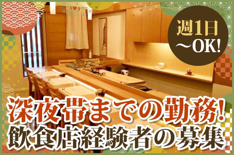 仕事内容 【深夜2時まで、効率よく稼ぎたい方に最適】 現在、週3~5日ほど安定してシフトに入っていただけるフリーターの方歓迎 深夜帯はお片付けや翌日の準備といった裏方作業がメイン。落ち着いた環境で、集中してお仕事に取り組めます。 裏方作業がメインの寿司屋でのホールスタッフ。お客様との対話が少ないため、接客よりも作業に集中し、真面目に仕事に取り組みたい方に向いています。 ☆具体的な業務 ・お酒の提供 ・席の準備 ・裏での洗い物作業 ・閉店後の洗い物や掃除 ・テーブルセッティング、片付けなど(業務習熟度による) 経験ゼロでもこれで安心 1.裏方での洗い物や準備がメインで、難しい調理業務はほとんどありません。 2.カウンター8席で目の行き届く広さなので、焦らず業務を覚えられます。 3.エプロン無料貸与に加え、先輩スタッフが丁寧にフォローします。 *一生懸命で真面目に勤務できる方歓迎! *責任感のある方積極採用中! 頑張りはしっかり評価します! できることが増えれば昇給も有♪ シフト相談しやすく、長期で安定して働きたい方も。 頑張りは昇給や正社員登用でしっかり評価します。 しっかり働いて収入UPしたい方にもオススメ! 年明けてからの勤務開始もOKです! 週4日勤務歓迎!安定して収入を確保したい方に最適 正社員登用制度あり!キャリアアップを目指せる 高時給1200円〜、22時以降は時給1500円〜