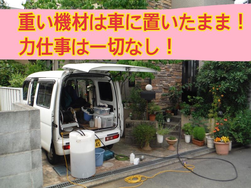 仕事内容 >>>>> ここがPoint! <<<<< ✅無資格・未経験・学歴不問 年齢不問で正社員スタート! 中高年スタッフも活躍中! ✅完全週休2日制で残業ほとんどナシ! ※夜勤・夜間作業も一切ナシ! ✅あなた専用の軽バンをご用意! 作業中の休憩時間は自分のタイミングで 取ってOKです! =================== <具体的な仕事内容> 新築住宅や一般住宅での、 消毒や点検などの簡単軽作業をお願いします。 床の隙間から消毒や防虫効果がある薬剤を スプレーする業務がメインです。 重い薬剤は社用車に積んだままで、 そこから伸ばしたホースを使って 床の隙間に振りかけていきます◎ 作業中は専用のマスク・手袋を 着用しますし、力作業はありません。 ◎1現場の作業時間は、 新築住宅で30~45分、 一般住宅だと1時間半~2時間程度。 1日に約3~7件ほど回ります。 1日に4時間くらいが作業時間で、 あとはクルマでの移動時間です。 ※現場は都内(杉並・中野・板橋等)や 埼玉県(川口・浦和)が中心です。 ▶時間通りに現場で作業していただければOK! 休憩も自分のペースで取ることが可能! ※最初のうちは、先輩スタッフが 一緒に行動します。 3か月後の独り立ちを目指して、 業務を覚えていっていただければと思います。 ※状況に応じて、現場でお客様に メンテナンス工事の提案や見積もりを 行うこともあります。 =================== <一日の流れ> ※一例です。 ▼07:30 出勤 ▼08:00 事務所を出発 ▼09:00 現場作業 (1日3~4件訪問) ▼13:00 作業終了・昼休憩 (昼休憩はどの時間帯で取ってもOKです!) ▼14:00 休憩終了 ▼15:00 帰社・事務作業 ▼17:00 退勤 事務所内にシャワーがあるので、 さっぱりしてから帰宅してもOK!