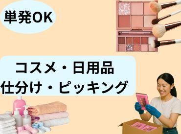 仕事内容 \副業・学生さん歓迎!カンタン軽作業♪/ 大手ドラッグストア向け日用品(洗剤、ティッシュ、衛生用品など)・コスメの仕分け・梱包作業をお任せします。 作業はとってもシンプル! ・ハンディ端末を使って商品をピッと読み取り ・配送先ごとに分けて箱詰め ・指定された通りに台車で運ぶだけ! 未経験スタートの方がほとんどですが、 研修がしっかりあるので安心して始められます◎ 【POINT】 ◆1日だけの勤務もOK!好きな日に働けます! ◆友達同士の応募も大歓迎♪ 7月~8月末までの期間限定で働きたい方や、 「この日だけ空いてるから働きたい」という方にピッタリ! さらに【時給1300円】の高時給デーもあり! このチャンスをお見逃しなく!