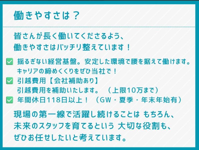 休日休暇 ✨ 休日・休暇 ✨ ─────────────────── 休日:年間118日以上 (会社カレンダーによる) ※年間休日:113日 有給休暇:5日以上 (※昨年度実績) 日曜日、祝日、他(土曜日休み有) ■長期連休 ・GW休み(昨年実績10日) ・夏季休み(昨年実績11日) ・年末年始休み(昨年実績9日) 休暇:年次有給休暇 (入社半年後10日付与) 慶弔休暇 休業:育児休業 介護休業