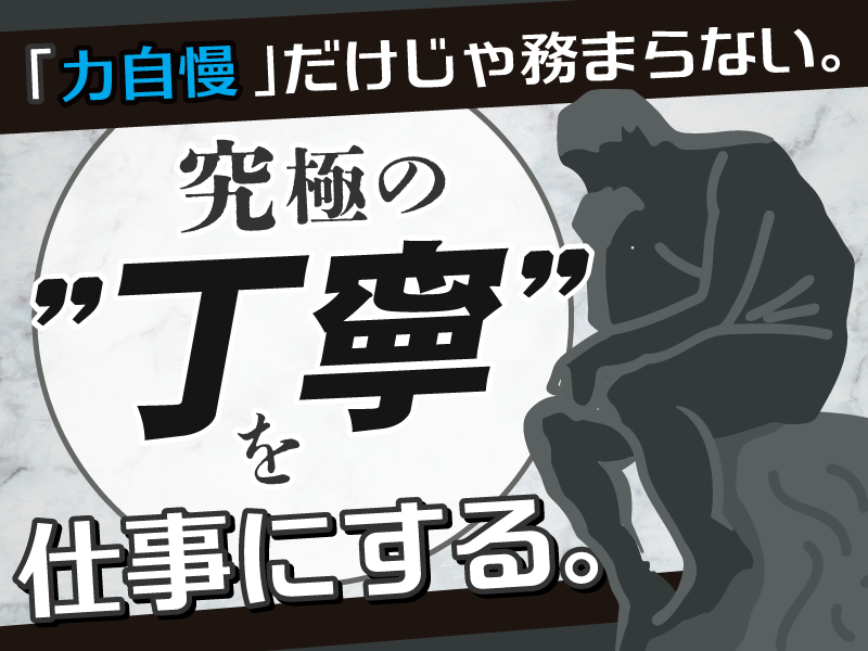 職場環境 男性スタッフ9割以上! 趣味や夢の実現と仕事を両立をしたい方、 モノづくりや繊細な作業が好きな方、 美術品や芸術が好きな方等が活躍中! 【やさしく、やさしく】 搬入から搬出までの工程は、 先輩が作業の流れと共に ちょっとしたコツも しっかり教えます。 喫煙所:なし(敷地内全て禁煙)