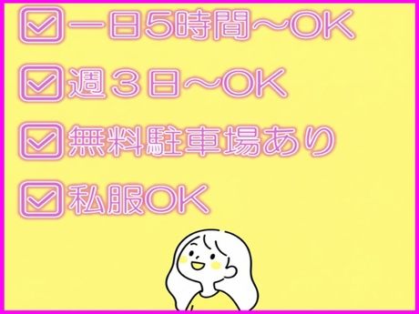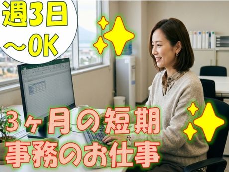 勤務時間 【勤務期間】 こちらは3ヶ月の短期間のお仕事です! ※延長のご相談もさせていただく場合があります 【勤務曜日】 月、火、水、木、金の間で週3日~5日 【勤務時間】 (1)9:00~15:00 (2)10:00~16:00 などの実働5時間勤務(1時間休憩あり) ★残業ほぼなし! ★扶養枠内での勤務可能!