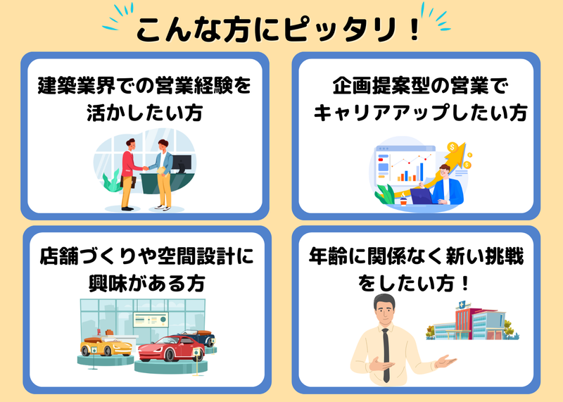求めている人材 Q:どんな人と働きたいですか? A:いろんな職種のスタッフとしっかりコミュニケーションを取りながら、プロジェクトを引っ張っていけるような方は、きっとすぐに活躍できると思います! 当社では、商業施設やオフィスだけでなく、教育・医療・物流など、さまざまなジャンルの空間づくりにもチャレンジしているので、これまでの経験を活かしながら、新しいことにも前向きに取り組んでくれる方と、一緒に切磋琢磨できたら嬉しいですね! ✅今回は営業経験者の募集になります! ≪必須条件≫ ・普通自動車免許をお持ちの方 ・建設または不動産業界で何かしらの営業経験(5年以上/法人個人問わず) ・建設または設備施工管理経験がある方(5年以上) ※最終学歴:大学院or大学or短期大学卒以上 ≪歓迎条件≫ ・プロジェクトリーダーの経験がある方 ≪こんな方にピッタリ!≫ ◎建築業界等での営業経験を活かしたい方 ◎企画提案型の営業でキャリアアップしたい方 ◎店舗づくりや空間設計に興味がある方 ◎セカンドキャリアを見据えた転職を希望される方