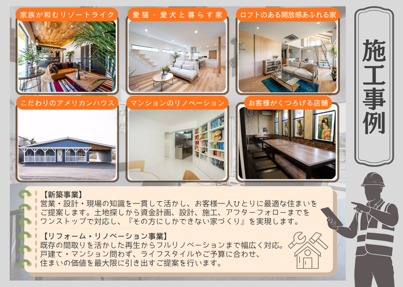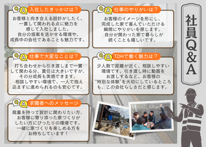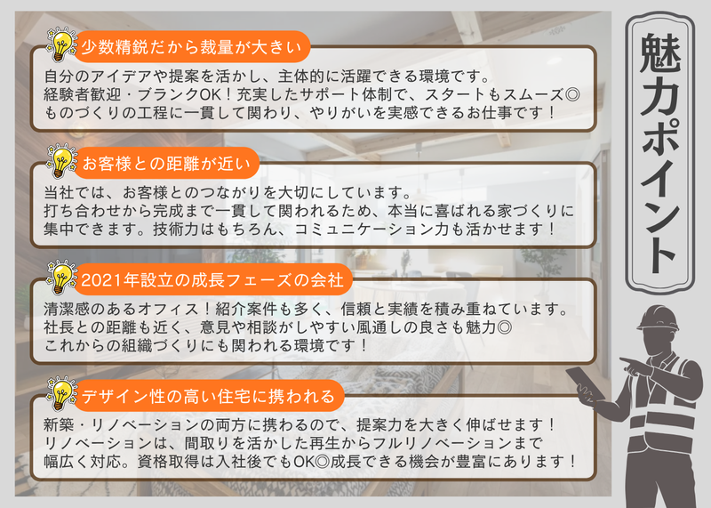 求めている人材 \\学歴不問!ブランクOK// 経験者歓迎!UIターンも大歓迎!! 資格は入社後取得でOK!すぐに活躍できる環境です✨ ≪必須≫ ・高卒以上 ・普通自動車免許 ・設計の実務経験(5年以上) ≪歓迎要件≫ ・お客様対応から設計まで携わった経験のある方 ・CADの使用経験のある方 ・営業または設計の実務経験のある方 ・二級建築士資格をお持ちの方 ≪こんな方にも◎≫ ◎家づくりに興味がある方 ◎もっと自由に設計がしたい方 ◎経験を活かしてキャリアアップしたい方 ◎裁量を持って働きたい方 ◎幅広くスキルを身につけたい方 ◎人の喜ぶ顔を見るのが好きな方 ◎地元で長く働きたい方 など♪ ✅社長の想い 住宅業界では、設計・営業・現場管理と分業されることが一般的。 ただ、その分「お客様との距離」が遠くなってしまうことも多いと感じています。 だからこそ当社では、 打ち合わせから設計、完成までを一貫して関わる“ワンストップ”の家づくりを大切にしています。 お客様の想いを直接受け取り、それをカタチにし、 完成したときに喜んでいただける瞬間が、この仕事の一番のやりがい。 引き渡しの際には、感謝の気持ちを込めてサプライズで動画をお渡しするなど、 “家をつくるだけではない体験”も大切にしています。 これから組織として成長していく中で、新しい仲間を募集します! ぜひ一緒に、お客様の想いに寄り添った家づくりをしていきましょう。