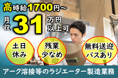 仕事内容 月収31万円以上可能!!高時給1700円★外国籍の方も活躍中♪ <仕事内容> 車やバイクのエンジンを冷やすためのラジエーターを作るお仕事です。 自動車や機械用熱交換器専門メーカーでのラジエータの製造をお任せします! (主にアーク溶接) 個人ブースで複数の金属を溶かして接合する作業になります。 ブランクのある方もお気軽にご相談下さい。 手順通りの作業なので、製造経験のある方であればスグ慣れる事ができるお仕事です。 立ち作業でのお仕事です。 重量物を扱う(15㎏以上)可能性がございます。 個人作業となります。 《環境》 男性が多い職場です。 ロッカー有り|休憩室完備 アピールポイント <仕事内容> 車やバイクのエンジンを冷やすためのラジエーターを作るお仕事です。 自動車や機械用熱交換器専門メーカーでのラジエータの製造をお任せします! (主にアーク溶接) 個人ブースで複数の金属を溶かして接合する作業になります。 ブランクのある方もお気軽にご相談下さい。 手順通りの作業なので、製造経験のある方であればスグ慣れる事ができるお仕事です。 立ち作業でのお仕事です。 重量物を扱う(15㎏以上)可能性がございます。 個人作業となります。 《環境》 男性が多い職場です。 ロッカー有り|休憩室完備 \充実した福利厚生/ ◎社会保険・雇用保険完備 ◎有給休暇有(6ヶ月経過後、10日付与)※規定あり ◎残業手当 ◎交通費支給(月24000円まで)※規定あり ◎確定拠出年金制度 ◎週払い制度(週3回対応) ◎お友達推薦制度あり(規定有り) ※1名につき3万円~10万円臨時給与として支給 ◎車(マイカー)・バイク通勤可(無料駐車場あり) ◎制服貸与 ◎食事持参可 ◎食堂あり(500円程度) ◎無料送迎バスあり ◎ロッカー・休憩室利用可 ◎福利厚生プログラム (宿泊、グルメ、ショッピングなど大幅割引が受けられる10万アイテムのメニューがあります。)