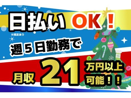 時給1,350円~1,688円 給与 時給 1350円~1688円 ■給与について ・時給1350円~1688円 ※残業時は時給1688円 ※残業は希望制につき強制ではありません! 稼ぎたい方にはおすすめです! \高時給で稼げる!/ 残業なしでもしっかり稼げるのがポイント! 交通費:交通費支給 交通費月2万円まで支給(規定支給) 【給与例】 給与例 ■日収1万3500円 …時給1350円×1日10時間 ■週4日(月16日)勤務で月収21万円以上可能! …1万3500円×16日=21万6000円+交通費支給◎