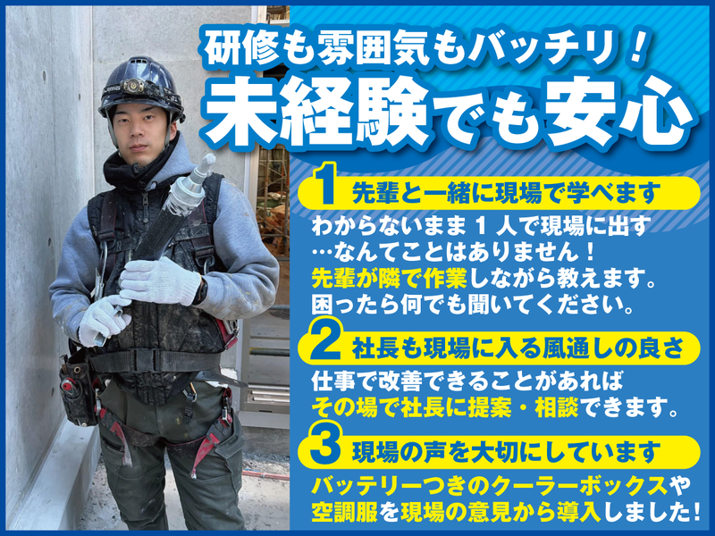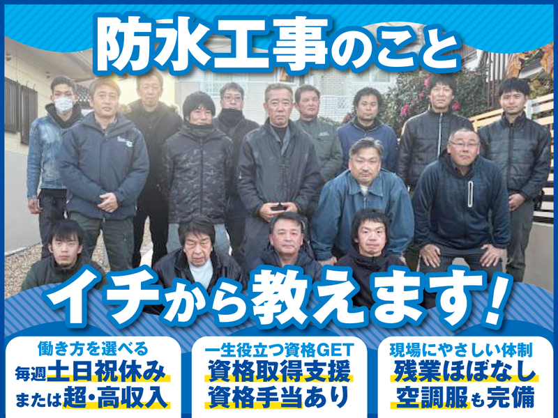 仕事内容 ◇未経験から安心スタート! ◇生活スタイルに合わせて選べる働き方 ・メリハリ重視/完週休2日(土日祝休み) ・ガッツリ稼ぐ/週休2日(日祝休み) ◇日給1.5万円〜&スキルに応じて昇給 ■仕事内容  ̄ ̄ ̄ ̄ ̄ ̄ ̄ ̄ ̄ ̄ ̄ ̄ ̄ ̄ ̄ ̄ ̄ ̄ ̄ ̄ 埼玉県・東京都エリアを中心に、 建物の屋上・ベランダの防水工事における 施工管理業務をお任せします。 防水層を施工することで、雨や劣化から 建物を守る、社会的に需要の高い仕事です。 ・・・ ▼未経験の方は… ベテランスタッフ同行のもと、 基礎から段階的に覚えていきましょう。 ①現場の流れを知る ・朝礼・現場巡回への同行 ・工事全体の流れ、職人さんの動きを把握 ・現場ルール、安全管理の基礎 ②写真撮影・作業記録 ・工事写真の撮影 (施工前・施工中・完了) ・黒板の使い方 ・写真整理、簡単な報告書作成 ③書類・事務作業 ・簡単な日報・工程表の確認 ・資材数量のチェック ・書類のファイリング ・入力作業 ④職人さん・協力会社とのやり取り ・打ち合わせへの同行 ・指示の出し方、段取りの覚え方 ・材料発注の補助 ⑤管理業務にチャレンジ 慣れてきたら、施工管理としての業務を 段階的にお任せしていきます。 ・工程管理/工期の調整 ・品質管理/仕上がり確認 ・安全管理/危険箇所のチェック あなたの成長に合わせて、むりなくステップ アップできる環境です。 ■未経験からはじめやすい体制  ̄ ̄ ̄ ̄ ̄ ̄ ̄ ̄ ̄ ̄ ̄ ̄ ̄ ̄ ̄ ̄ ̄ ̄ ̄ ̄ ◇先輩が必ず同行 わからないまま、ひとりで現場に出す ことはありません。 困ったときはその場でどんどん聞いて くださいね! ◇社長も現場に入る風通しの良さ 社長自ら社員と一緒に作業することも多く 気づいたことや改善点は、その場で 相談・提案できます。 ◇現場の声を大切にする会社 夏場に嬉しい空調服や、バッテリー付きの クーラーボックスも現場スタッフの意見 から導入されました。 ■選べる働き方  ̄ ̄ ̄ ̄ ̄ ̄ ̄ ̄ ̄ ̄ ̄ ̄ ̄ ̄ ̄ ̄ ̄ ̄ ̄ ̄ ライフスタイルや目標に合わせて、働き方を 選べるのが当社の大きな特長です。 ▶土日祝休み/バランス重視 仕事とプライベート、メリハリをつけたい方 に選ばれている働き方。 むりのないペースで長く続けたい方や 生活リズムを整えたい方におすすめです。 ▶土曜出勤でがっつり稼ぐ とにかく収入を増やしたい方は、 日祝休みで高収入を目指せます。 日給制だから、土曜日に出勤した分は そのまま収入に! 短期間で稼ぎたい方に最適です。 ・・・ ◇働き方は途中で切り替えもOK 最初は土日祝休みでスタートし、 慣れてきたら「稼ぐ働き方」に変更する ことも可能。 今の自分に合った働き方を選びながら、 収入アップも目指せる柔軟な環境です。 ■スキルアップ・キャリアアップを応援  ̄ ̄ ̄ ̄ ̄ ̄ ̄ ̄ ̄ ̄ ̄ ̄ ̄ ̄ ̄ ̄ ̄ ̄ ̄ ̄ 経験を積めば、 ・現場をひとりで管理 ・複数現場を担当 ・役職登用 など 安定して稼げるポジションを目指せます。 資格取得支援制度も充実しているので 働きながらスキルアップも可能です! 取得後は、資格手当で収入アップ。 努力した結果が収入に繋がるから、 モチベーション高く頑張れると好評です。