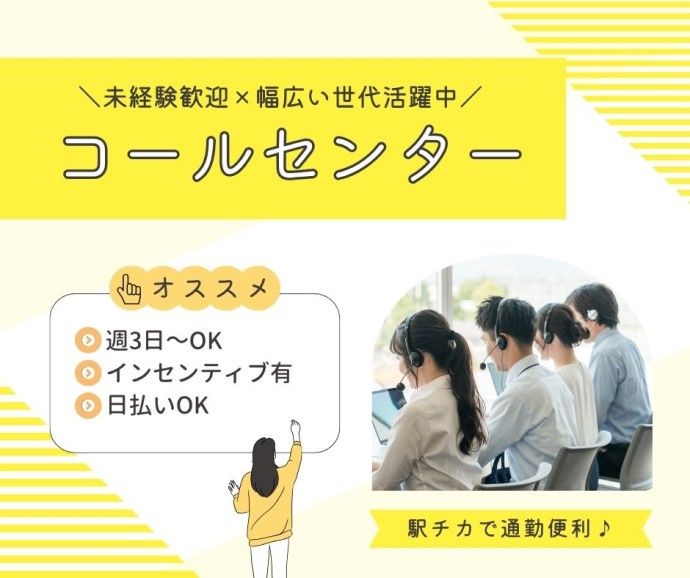 仕事内容 / コールセンター×既存顧客への発信 扶養内勤務OKでしゅふさんも活躍できる環境◎ 研修制度充実で未経験から始められやすい◎ 経験や年齢も不問です!! \ ▼仕事内容 CMやネットで話題人気の健康食品や化粧品を扱う コールセンターでの発信業務をお願いします! 〜対応の流れ〜 ①商品を購入されたお客様に実際の使用感や感想など確認のフォローコール ②お肌や体のお悩みに合わせた別商品のご提案 ・商品のお問合せに対する返答 ・パソコンへ簡単なデータ入力(知識は不要) 発信先は「既存顧客のみ」なので 未経験の方も安心して対応していただけます◎ インセンティブ制度も充実! ┗直近の支給例:6万円!