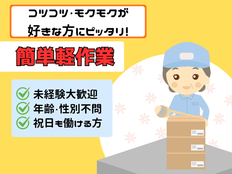 求めている人材 ■未経験歓迎! ■年齢・性別不問! ■コツコツ・モクモク作業が苦手で無い方! ■祝日も出勤可能な方!