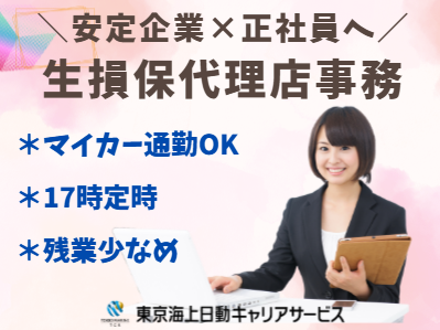 仕事の内容 \安心大手の×東京海上グループ/ ◆金融未経験からスキルアップ! ◆社員前提「紹介予定派遣」で長く働ける◎ 【基本情報】 雇用形態:派遣社員 雇用期間:長期(3カ月以上) └ 26年1月~開始日相談可能 就業時間:9:00~17:00(休憩60分) 【必須条件】 ◆パソコン:基本操作(入力~修正) 【お仕事内容】 ・見積書・申込書作成 ・データ入力 ・契約管理 ・団体自動車保険の切替・提案 ・電話募集 ・電話応対、窓口対応 ・ファイリングなど ※ご勤務決定後、生損保資格を取得いただきます ※お仕事の流れはきちんと教えていただけます 【環境面等】 ・東京海上グループの保険代理店 ・30代・40代・50代の多い職場 ・穏やかで落ち着いた雰囲気 ・オフィスカジュアル内で服装自由 【福利厚生等】 ・ランチタイムは休憩スペース利用OK └お弁当持参OKです ・扶養内OK ・禁煙オフィス!煙苦手な方も安心 ・平日のみOK!土日祝休み ・年間休日120日以上&お休み相談可 └有給休暇、年末年始休暇など ○●嬉しいPOINTたくさん!●○ 開始日相談ください/マイカー通勤OK/ブランクOK!主婦・主夫活躍中/ワーママ活躍中!子育てに理解のある職場/保険未経験OK!/1日7時間以内勤務