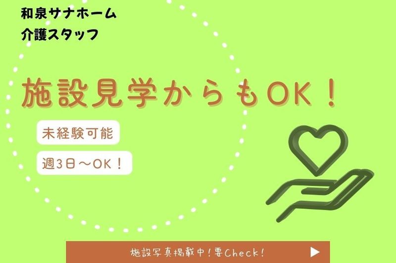 アピールポイント: 《✼当施設の魅力✼》 私たち「 和泉サナホーム」は、 “利用者様のその人らしい 暮らし”を大切にする施設です。 ■ スタッフ構成 男性:女性=4:6 20〜40代が中心の明るい雰囲気♪ ■ 職場の雰囲気 「ありがとう」が飛び交う、 人と人との温かさを感じられる職場。 スタッフ同士の連携も良く、 未経験でも安心して成長できます。 ■ 設備も充実 清潔で明るい館内。 安心して働ける環境が整っています。 ★資格取得も“全力サポート”!★ 働きながらステップアップできる制度完備。 あなたのキャリアを長く応援します。