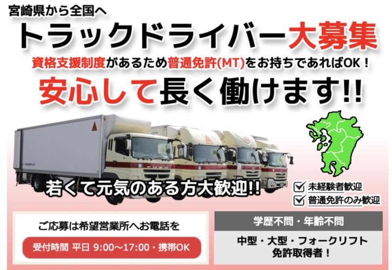 仕事内容 \経験者が「最後に選ぶ」環境がここにあります/ ▼∴▼∴▼∴▼∴▼∴▼∴▼∴▼∴▼∴▼∴ 【高収入】 頑張り次第で月給30万円以上も可能 【安定感】 毎日自宅に帰り、家族と夕食を囲める生活 【余裕】 1日5〜10件程度。詰め込みすぎない運行表 【将来】 希望者は将来的に「管理職」への道も用意 ▼∴▼∴▼∴▼∴▼∴▼∴▼∴▼∴▼∴▼∴ <<お仕事内容について>> ━━━━━━━━━━━━━━━━━━━ ▶︎月給 30万円以上も可能 ※経験・能力・配送件数を最大限に考慮します。 「もっと稼ぎたい」という意欲を給与で還元します。 <具体的な業務内容> 大型トラックでの地場配送(宮崎・鹿児島県内中心)をお任せします。 長距離・泊まり込みの勤務はないため、体への負担も少なく、私生活を大切にしながら大型のスキルを活かせます。 メイン業務: ・農場への飼料配送(4t) ・郵便物配送(都城局〜3店舗を1日3回転程度) 時期や上記の業務量の変化に応じて 下記仕事もお任せします▼ ・運送会社間の連携・中継配送 ・その他、地場の大手取引先への配送 配送件数: 1日5〜10件程度。 「とにかく件数を詰め込む」のではなく、 一件一件の安全を優先できるスケジュールを組んでいます。 \\ ✨経験者に選ばれる理由✨ // [1] 「稼ぎたい」と「帰りたい」を両立 「大型は稼げるけど家に帰れない」という常識を覆します。 残業は月30時間程度。 しっかり手当で稼ぎつつも、夜は自宅でリフレッシュできる。 この安定感があるから、50代・60代になっても現役で続けられる環境です。 [2] あなたの経験を「管理職」というキャリアへ 今回は、将来のリーダー候補としての募集でもあります。 現場でドライバー経験を積んだ後は、 配車管理や後進の育成などのマネジメント側へステップアップすることも可能です。 「一生現場もいいけれど、ゆくゆくは腰を据えて管理職を目指したい」という30代・40代の方、大歓迎です。 [3] 頑張りは「即、給与」へ反映 「子供の学費を稼ぎたい」「趣味にお金をかけたい」など、 稼ぎたい時は積極的に配送件数を増やすことも可能です。 あなたの意欲を会社が全力でバックアップします。 - ✅まずは「カジュアル」に始めませんか? - ✨履歴書不要✨ 「興味はあるけど、いきなり面接は緊張する…」 「履歴書を準備するのが正直、面倒…(笑)」 そんな方もご安心ください! 今回の募集では、応募・面接時に「履歴書」は一切いりません。 お気軽にご応募ください♪