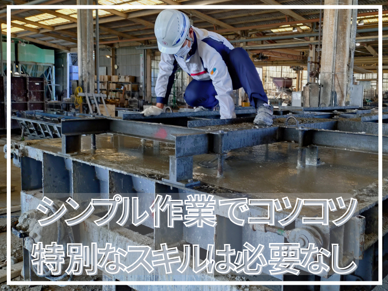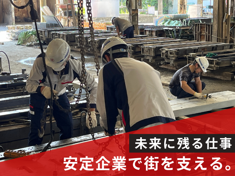 仕事内容 -おすすめポイント- ★機械を使うので重労働ではありません! ★未経験OK!特別なスキル&経験必要なし 必須資格は入社後、会社負担で取得可◎ ★得意な事を活かして、頑張りが評価に! - 道路や公園、橋や地下道など 至るところで目にするコンクリート。 道路や河川など、多くの方に利用して もらえるような、ずっとカタチとして 残っていく価値のある仕事です。 \働きやすさ抜群です/ ★ライフワークバランス重視! ◎平均残業15時間 ◎平均勤続12.4年 ◎平均年齢43.4歳 ◎育休消化率100% ◎有給消化率(2024年)81.8% *2時間単位での“時間有給”も 取得もOK! ※残業を希望しない方は、 原則として残業の強制はありません! <仕事内容> 道路や河川で使用されている コンクリート製のブロック等の 製造作業をお願いします。 <具体的には…> ★プリンをつくるようなイメージです★ ①コンクリートを流し込むための 型枠を作ります ▼ ②生コンクリートを流し込みます(打設) ▼ ➂型枠内のコンクリートから不要物(空気)を外に出します(振動締固め) ▼ ➃コンクリートを固めます(蒸気養生) ▼ ➄型枠から外します(製品脱型) ▼ ⑥仕上げ作業 ▼ ⑦完成!しっかり検査します ▼ ⑧運搬作業 ▼ ⑨出荷します ◆ほぼ100%が未経験からのスタート◆ フォークリフトやクレーンなどの 必須免許は、入社後に 会社負担で取得可能です◎ 丁寧に教えます! \しっかりした生産管理で残業削減/ 柔軟な人材配置と細かな情報共有で 生産性がUP! <当社について> 創業90年以上、社会のインフラを 支えるコンクリートメーカーです。 健康経営優良法人のホワイト企業で ワークライフバランスを重視! 従業員からの提案を積極的に募集する 制度があり、風通しの良い職場! 残業少なめ、有給の消化率も高く プライベートや趣味を優先できる 安定した環境がここにあります! 【先輩社員の方の声】 当社は、頑張りを評価してくれる会社です! インフラを支える仕事なので、 売上も安定して長く働く仕事を 探している方にはピッタリ! 地下に埋まっているモノだけでなく、 普段、目にする建物にも携われるので、 実際に自分が作ったモノが完成し多くの方に 喜んでもらえる瞬間にやりがいを感じられます♪ 雇用形態 正社員