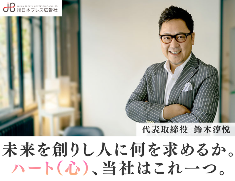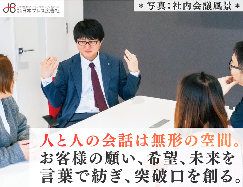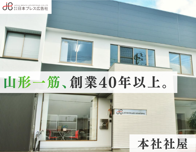 仕事内容 ✅山形で創業42年の総合広告代理店が強い意志を持ち、採用を始めます。✅ 突然ですが、新たに、 「広告法人営業・全方位支援を担うコンサルタント」 の募集を始めました。 8年後の創業50周年に向けて、 掲げている目標イメージ像は一つ。 『山形で最も企業の課題解決を全方位で実現する会社』 となります。 一般的に企業の経営資源は 【人、物、金、情報】と言われています。 上記に記した”全方位”という側面は 山形県内で事業運営を為されている 「全ての企業様」に向けて、 当社からのメッセージ・姿勢です。 どのような企業様においても、 事業が簡単に、ラクに進むという事はありません。 だからこそ、例え、 どのような課題をお持ちであったとしても、 運営に関わる様々な要素・項目に 当社が人間的にも深く関わり、課題を解決し、 未来へ導いていく存在を目指しています。 ✨仕事詳細の前に…当社について✨ ご紹介がまだでしたね。 当社、日本ブレス広告社は 1985年、山形に創業された総合広告代理店です。 現在は設立から42年を迎え、老舗の領域。 実績としても、歴史としても県内屈指、 山形県内TOP層に並ぶ広告関連企業となりました。 主な事業においては、 「テレビ・ラジオ・新聞・雑誌・イベント開催、 ホームページ制作・SEO対策、ネット広告 他」 など、企業様におけるメディアからデジタル展開まで 多岐に渡るご支援を実現する事が可能です。 ✨情熱は時に能力を超え、思いがけぬ未来を叶える。✨ これまで時を経ていく中で、 代表権(代表取締役の役職)も 血縁関係がない社員への継承が 時代の荒波を越えながら、 これまで3代に渡って紡がれてきました。 「人の意志あるところに未来在り」 を地でいくように、 人の可能性を信じて繋いできた歴史、 そして、仲間へのおもいやりがある会社です。 頑張ってきた仕事を最大限評価する事。 仲間が苦しんでいる時にあなたが助ける姿勢を 会社は見逃しません。 人に優しき、一緒に歩んでくれる人が、 上長として立つべきであると考えている為、 良きマネージャー・リーダーが育ちやすい環境であると思います。 ✅【人の支援】全方位での課題解決の新たな突破口「組織支援事業」も始まりました。✅ 広告事業との親和性が非常に高い、 「求人採用の実務支援」を大きく拡大しています。 おそらく、山形県内において、 「総合広告代理店でありながら、求人・採用の実務支援の独自ソリューションが存在する企業」 は相当希少性が高い存在です。 ”人の悩み”が社会的に加速している世の中において、 山形県内では特に求人・採用・人事のお悩みが非常に多くあります。 どういった基準・ご相談レベルかというと、 「出逢い、お話しする企業の代表社長は、ほぼ全ての方が現在・未来の自社社員について考えている」 という程です。 現状においてもご相談企業様が毎月増加しており、 上質な求人・採用を提供し、お客様は人員増加。 後に、新たな未来へ向けた広告展開で集客増加。 事業発展を願った上での各種取り組みが、 良い好循環を生み出し、人と企業の未来を創る。 こうした点が全方位でのご支援の一つの鍵になると考えます。 ✅詳細な仕事内容について✅ 山形県内の様々な企業様への広告法人営業となります。 とはいっても「売る」という側面ではなく、 企業の課題解決に向けたソリューション営業であると 認識して行動していく事が 当社の営業スタイルにおいてとても大切であり、 自らの目標達成の為に提案をするような事は 全く推奨していませんし、NGです。 ・売上向上に向けた販促企画なのか、 ・マスメディアを活用したブランディングか、 ・新たな展開に向けたマーケティング施策か、 ・地域共創の観点でのオリジナルイベント開催なのか、 ・業界横断型の新たな価値を提供する取り組みか、 ・企業の未来を創る、求人・採用の実務支援か、 残念ながら、 答えや正解となるものは未来の結果でしかありません。 業界によって傾向や過去の成功事例は存在しますが、 その時、その瞬間、企業様と目の前で対峙しながら、 どのように課題解決していくかを創出する点は この仕事の緻密であり、ダイナミックな醍醐味であり 私達の腕の見せ所でもあります。 ■広告法人営業・全方位支援を担うコンサルタントとしての姿勢■ 日頃から様々な視点や角度、感度を持った モノの見方が出来るとお打ち合わせ時の会話の幅が拡がります。 企業経営者の方や役員の方との折衝が多くなる為、 最初は緊張する事やそうした場面も出てくるかもしれませんが 自らの意見を言葉として発していく気概が最も大切です。 ■業務内容■ テレビ・デジタル販促・WEB企画・求人採用支援、 全ての領域において以下の(1)~(5)に沿った 基本的な行動を実施していきます。 (1)クライアントとの打ち合わせ・ヒアリング (2)広告企画の立案・プレゼンテーション (3)制作チームとの連携・進行管理 (4)広告の実施・運用・効果分析 (5)