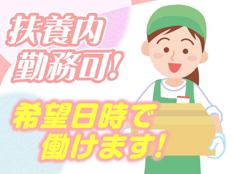 仕事内容 ✨商品は軽くてチーム制なので安心♪✨ ✨扶養内勤務もOK✨ 家庭やお子さんの用事などでの お休み調整や対応が可能です! \平日・日勤のみで働きやすく/ \無理なく長く続けられる軽作業のお仕事/ 【お仕事内容】 お菓子の箱や化粧品の箱などを 組み立て・検品し、 完成品を段ボールへ梱包する シンプルな作業です。 扱うのは軽い商品なので 体への負担も少なめなので安心です。 7~8名のチームで行うので、 未経験の方も安心して始められます。 【働きやすさのポイント】 ✅扶養内勤務も可能 ✅希望の曜日で働けます ✅お子さんの行事や家庭の都合による お休み調整もOK ✅食堂あり(仕出し弁当あり) ※お弁当の持参もOKです